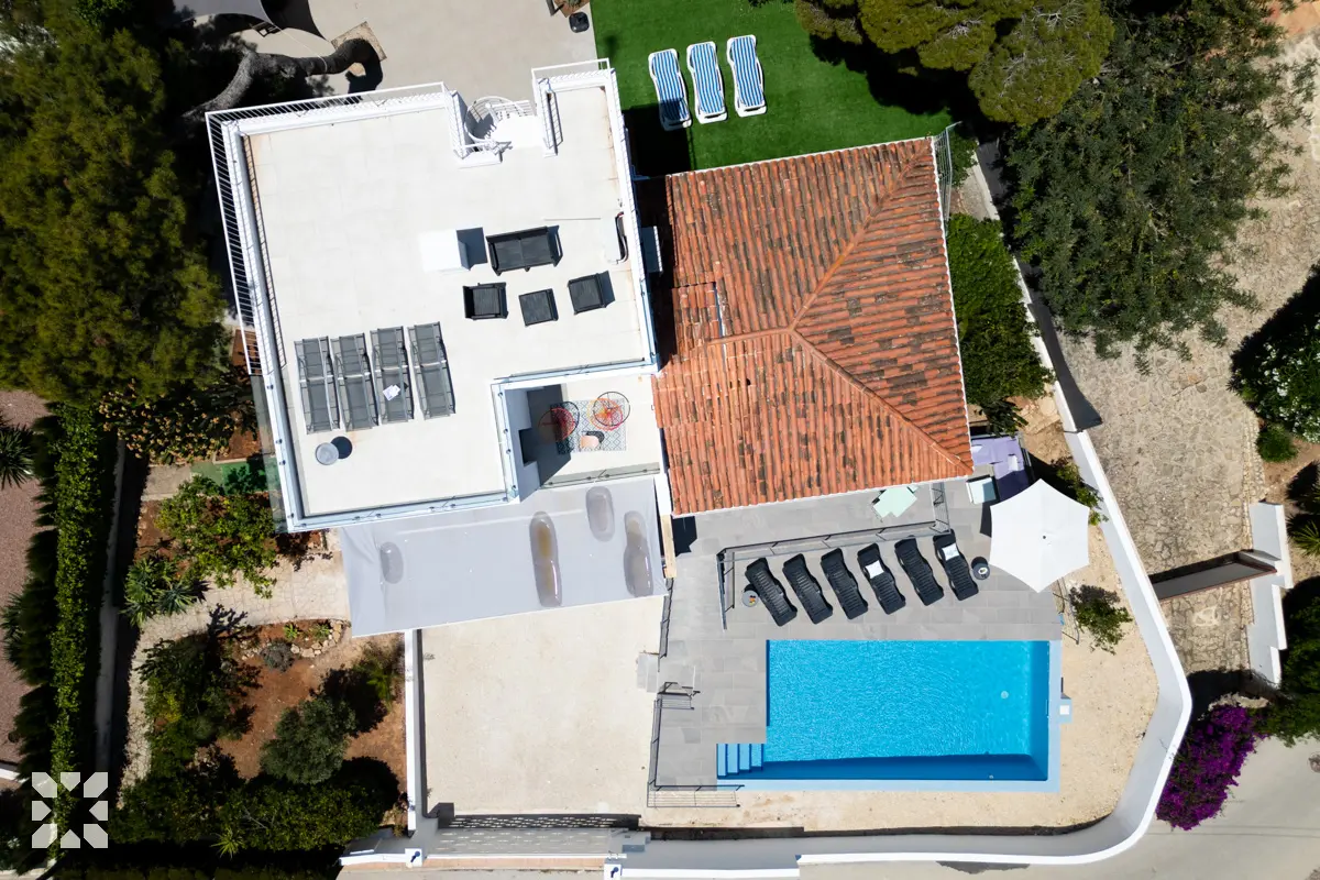 Зовнішня територія створена для відпочинку на свіжому повітрі. Тут є простора тераса з обідньою зоною та чудовим видом на море. У задній частині вілли облаштована літня кухня з барбекю, холодильником та пральною машиною. Приватний басейн розташований на нижньому рівні перед будинком, що створює затишну зону для відпочинку під сонцем.