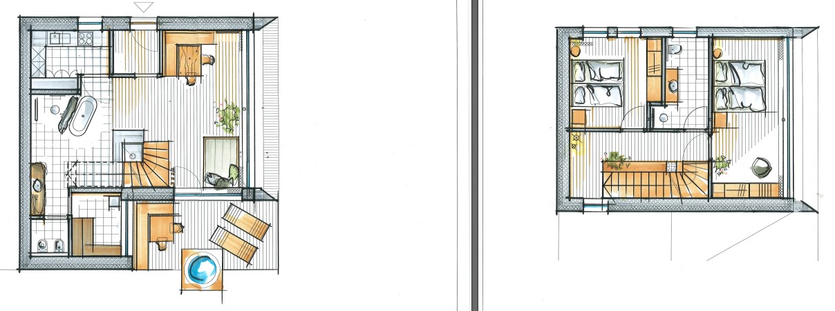 • Верхній поверх: дві спальні з панорамними вікнами, натуральні матеріали та високоякісні матраци; ванна кімната з душем; балкон.