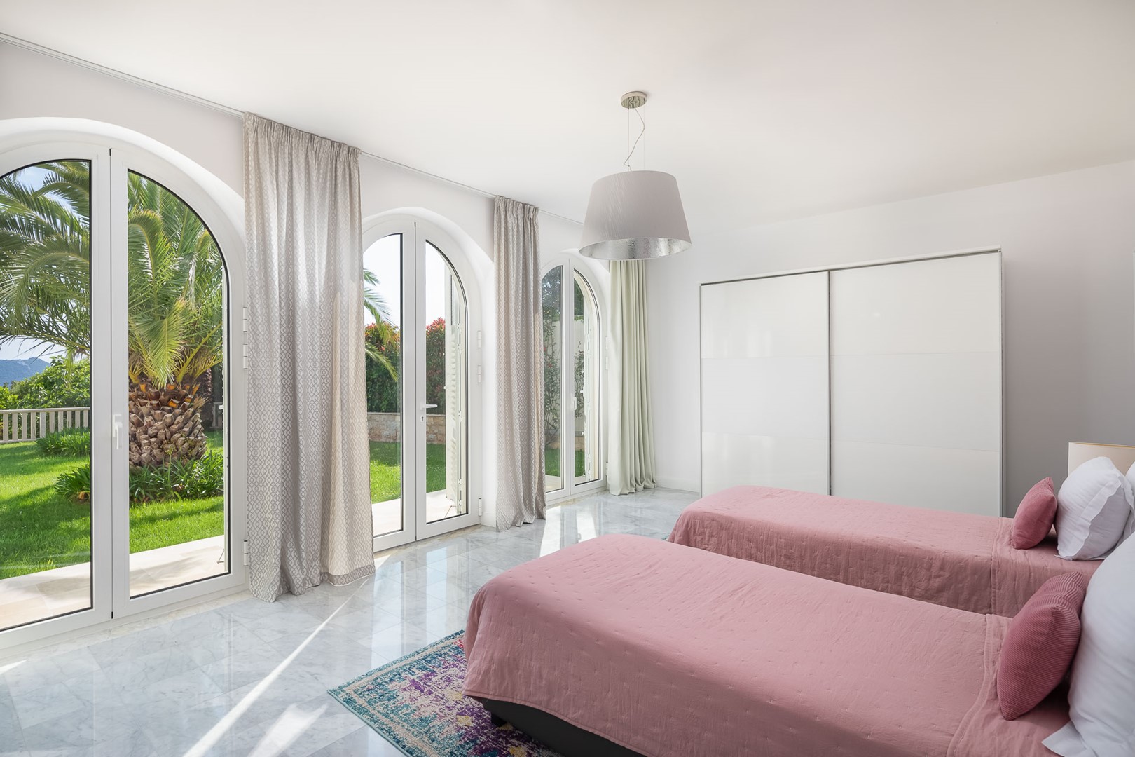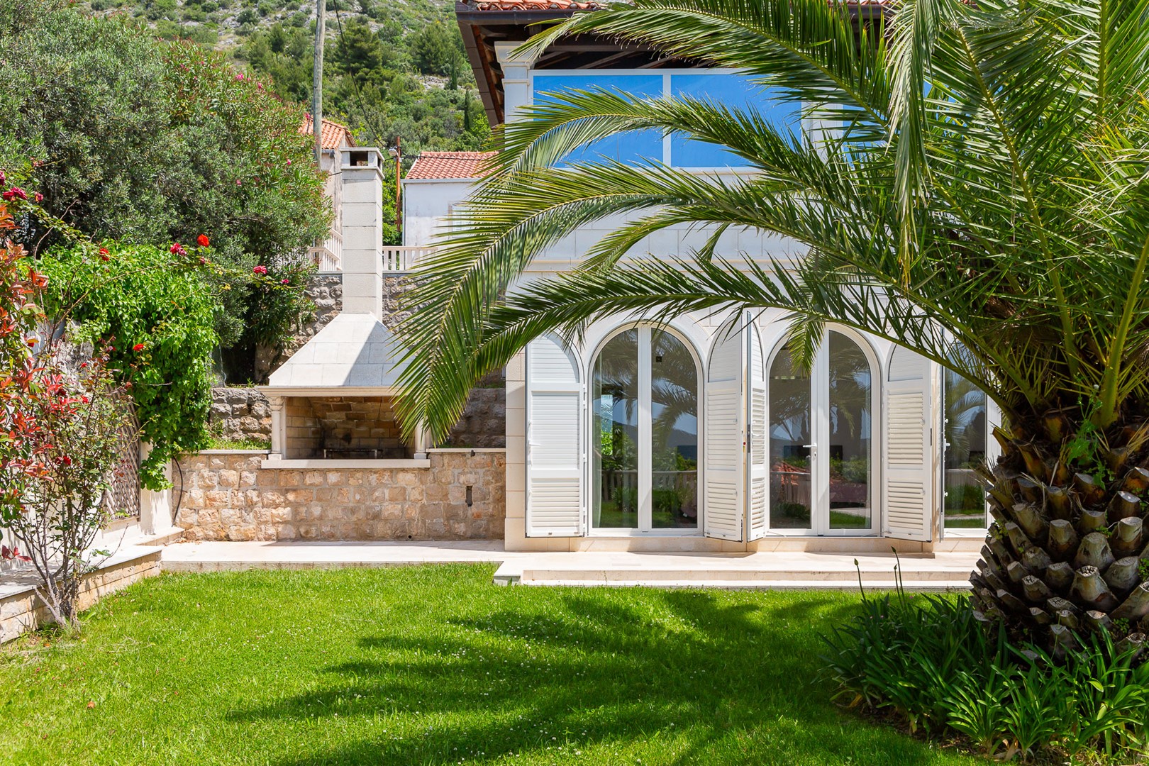 Просторий доглянутий сад із пальмами, кипарисами та квітковими композиціями створює спокійну, середземноморську атмосферу. Дві великі тераси обладнані лаунж-зонами та відкривають панорамні види на море та острови. На відкритій території розташований приватний басейн 5 × 11 м, сонячна тераса, обідня зона та барбекю — ідеальний простір для відпочинку на свіжому повітрі.