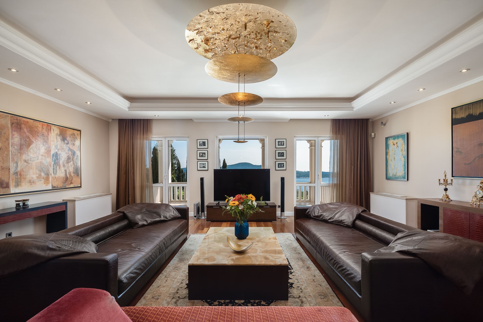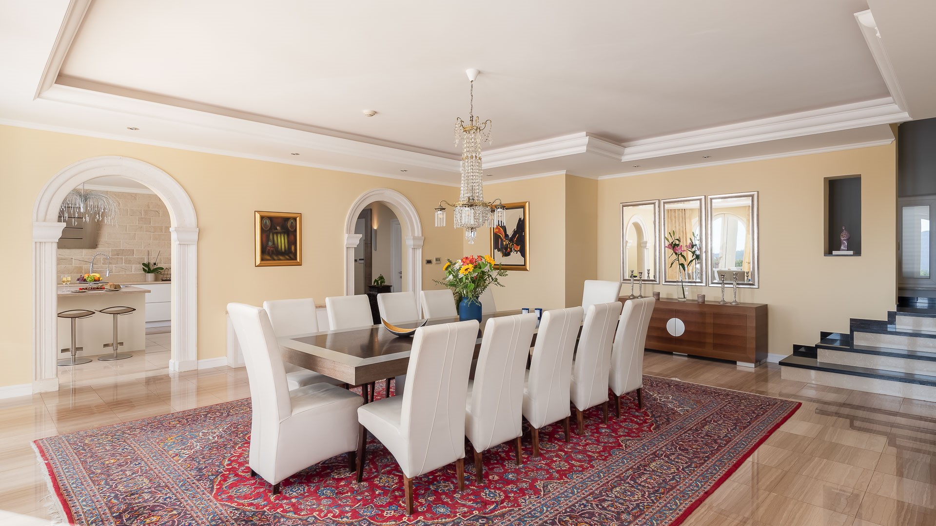 На першому рівні розміщено велику обідню залу зі столом на 12 гостей та повністю обладнану кухню з островом-баром. Тут же знаходяться три спальні з двоспальними ліжками: одна з власною ванною кімнатою, дві — зі спільною ванною з ванною. Інтер’єри доповнені роботами відомих хорватських художників та ретельно підібраними меблями.