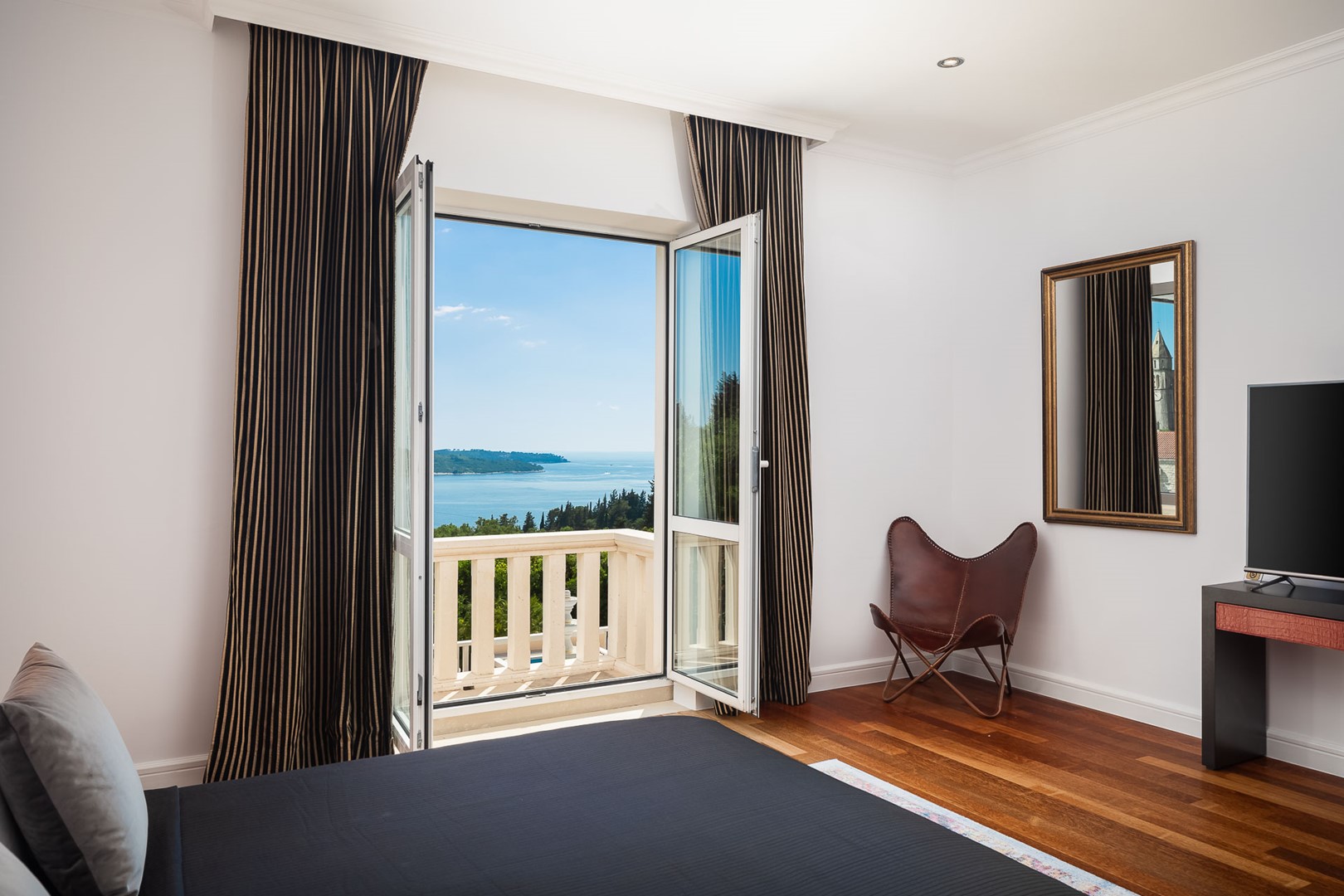 Другий поверх включає стильну вітальню з виходом на простору терасу з видом на Адріатику та дві майстер-спальні з king-size ліжками, гардеробними, власними ванними кімнатами та балконами.