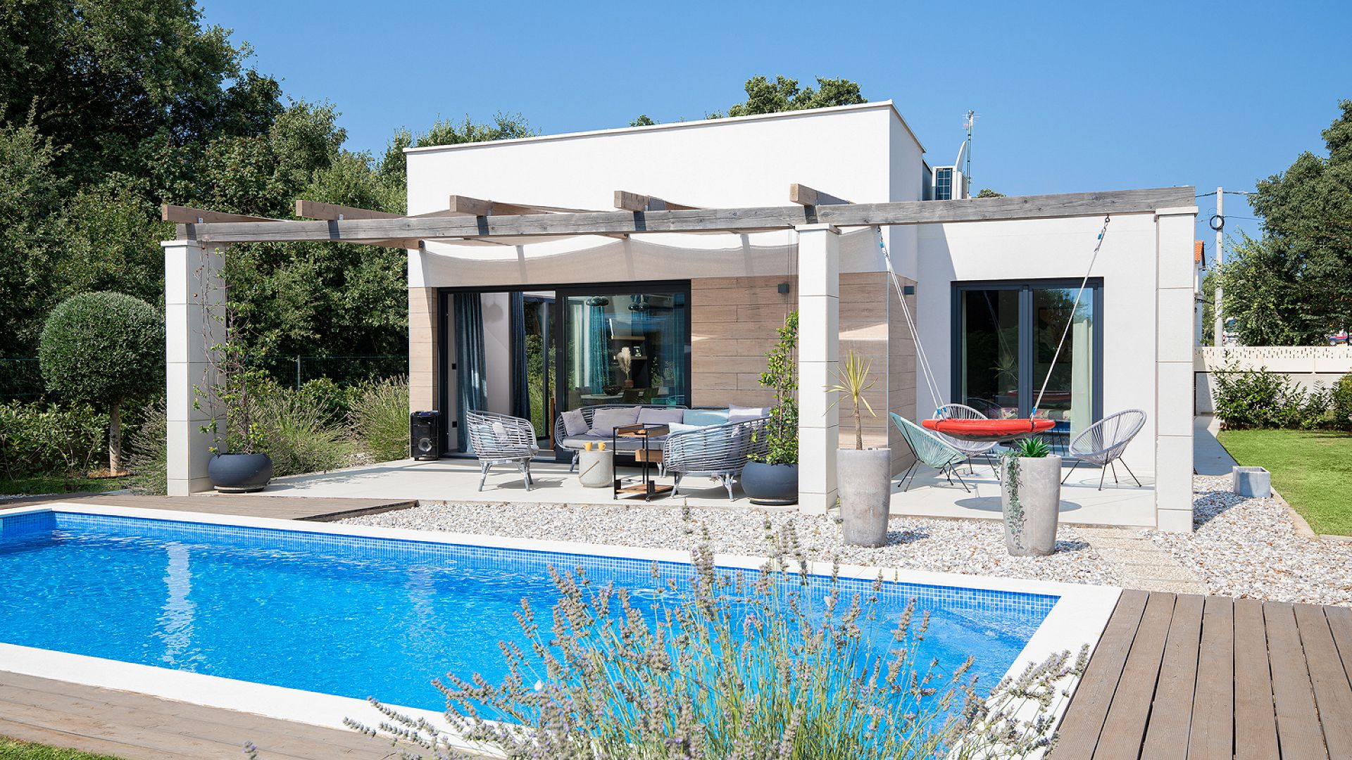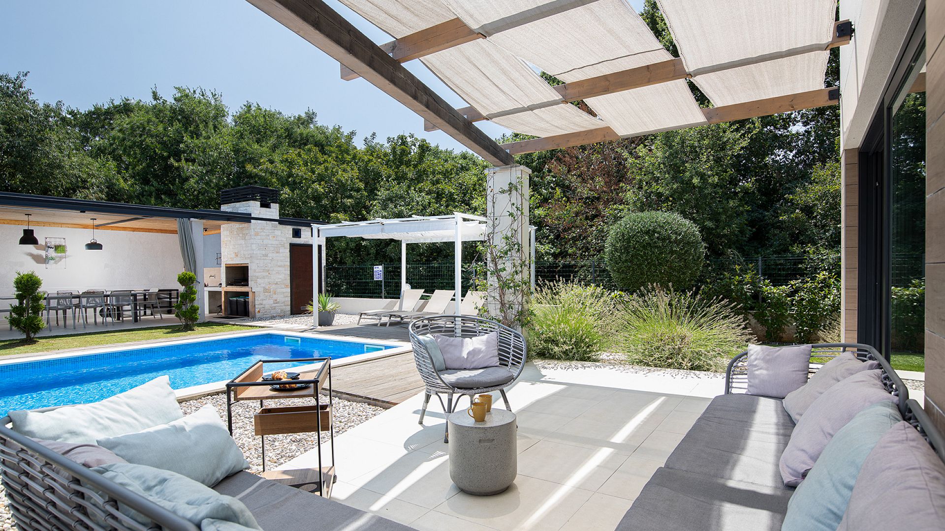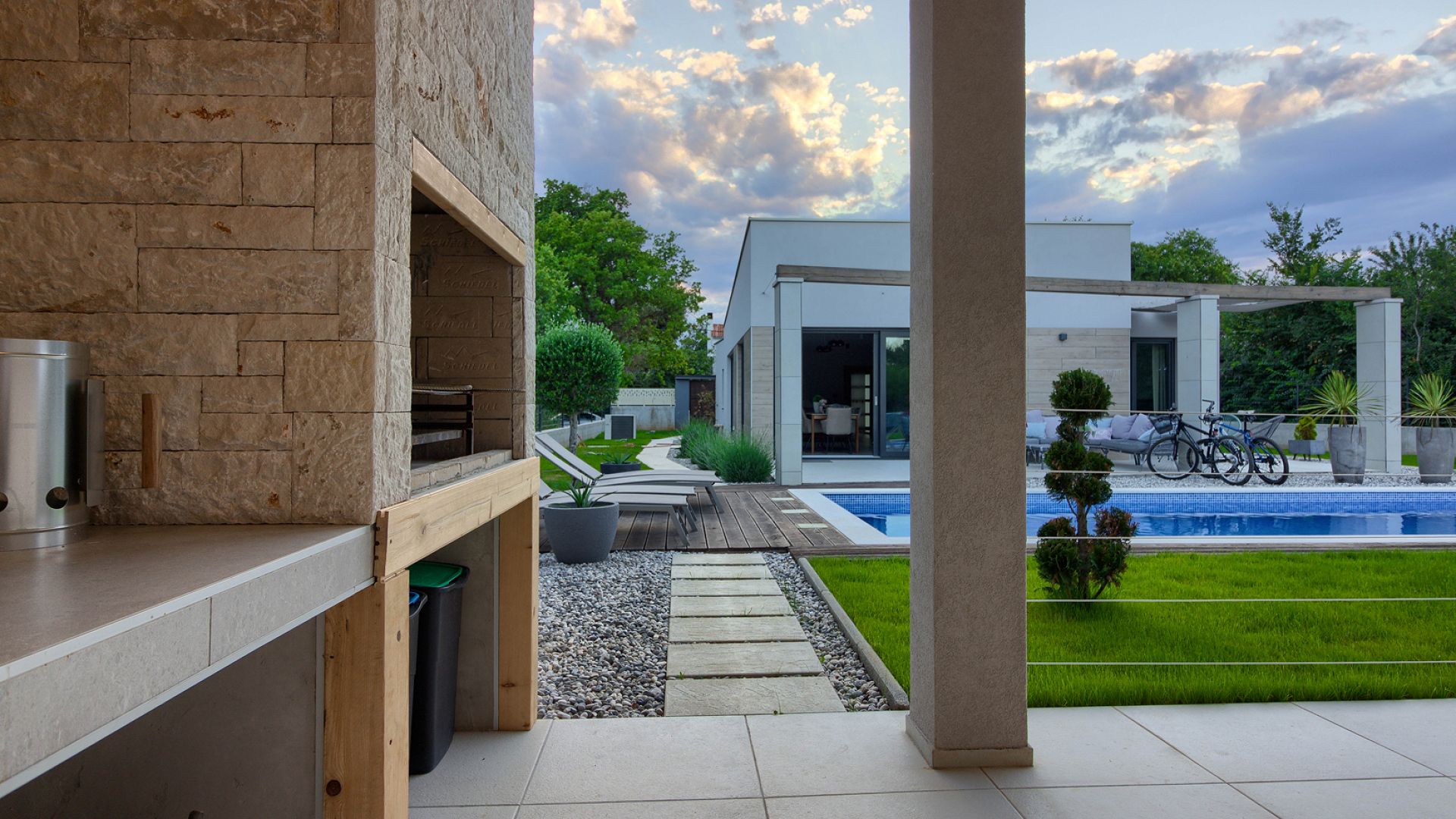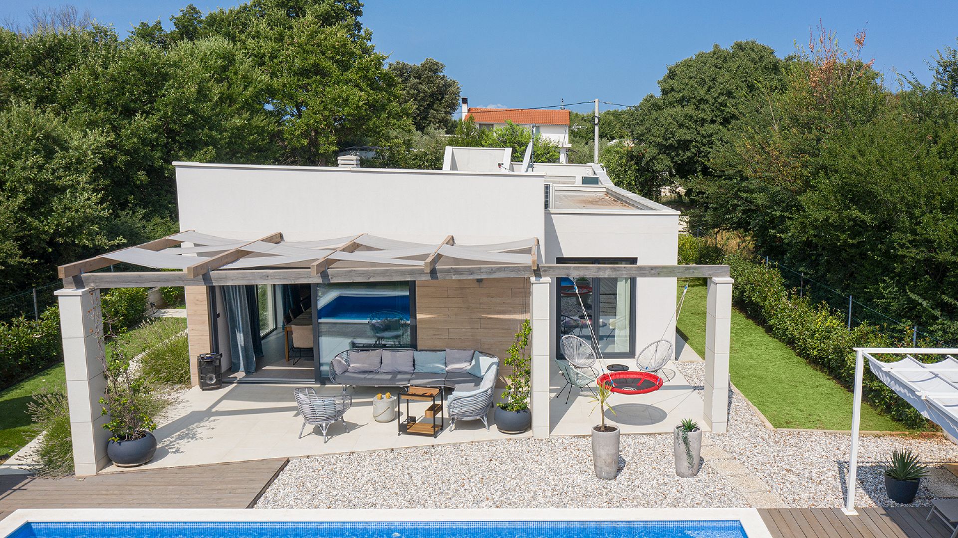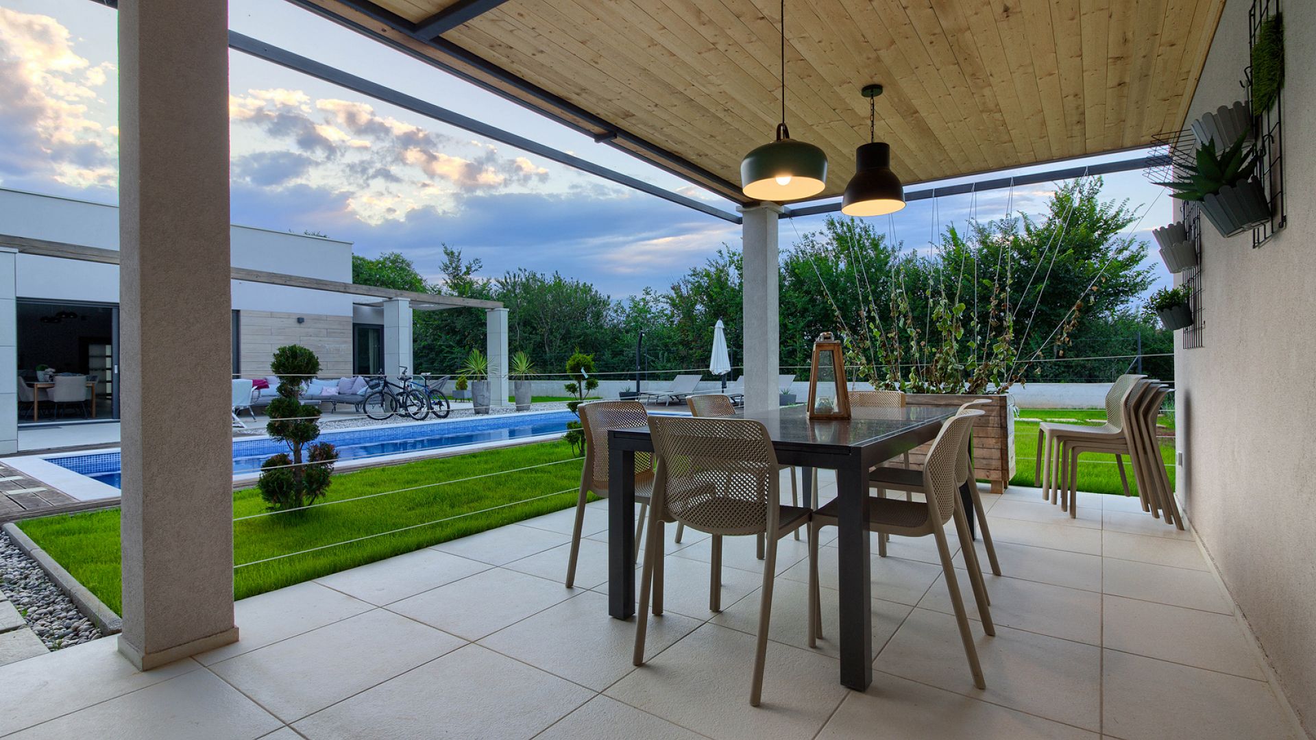 Будинок розміщений на просторій доглянутій території з садом і займає ділянку близько 2000 м². Архітектура сучасна, з акцентом на відкритий простір, світло та зручне зонування. Вілла комфортно приймає до 8–10 гостей.