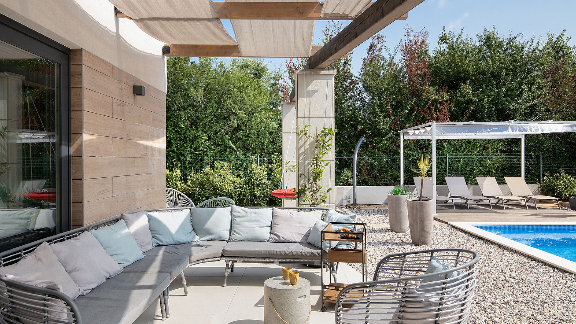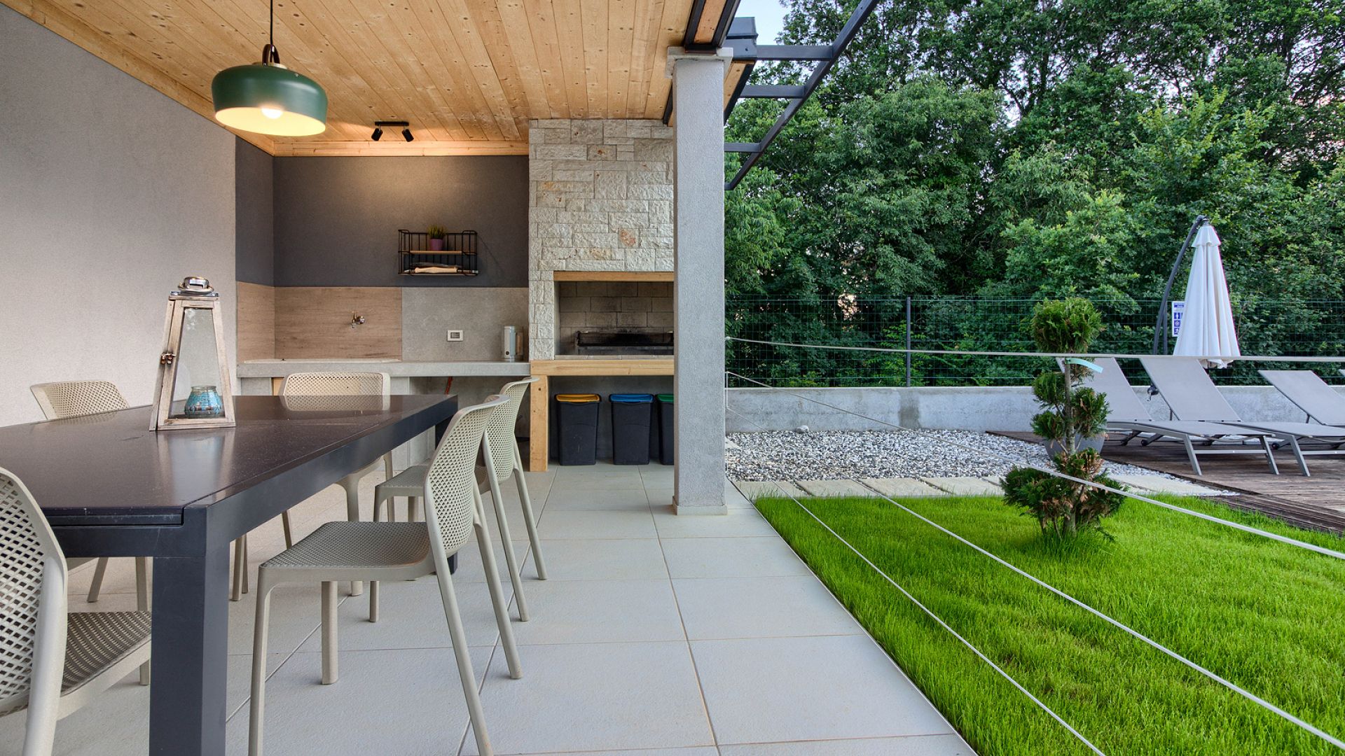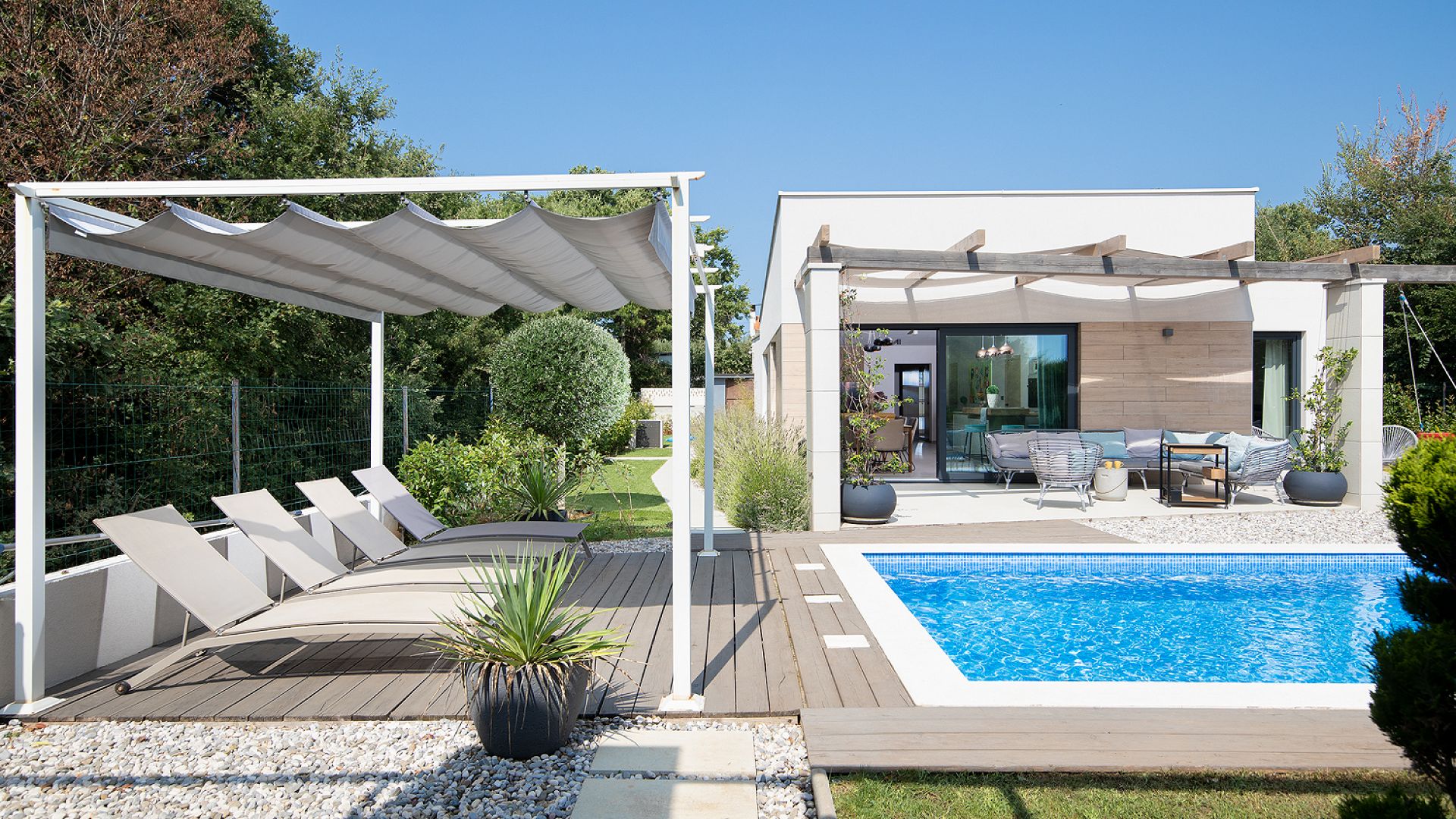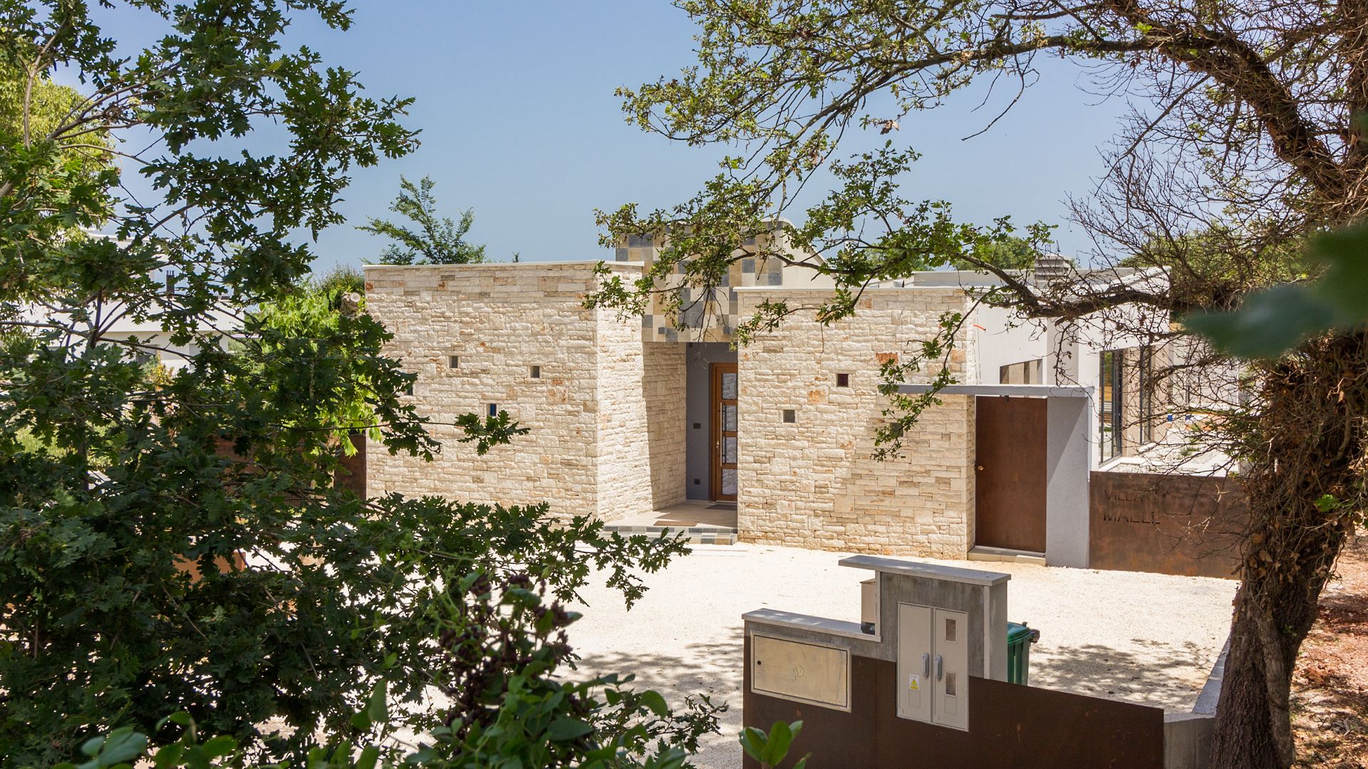 Будинок розміщений на просторій доглянутій території з садом і займає ділянку близько 2000 м². Архітектура сучасна, з акцентом на відкритий простір, світло та зручне зонування. Вілла комфортно приймає до 8–10 гостей.