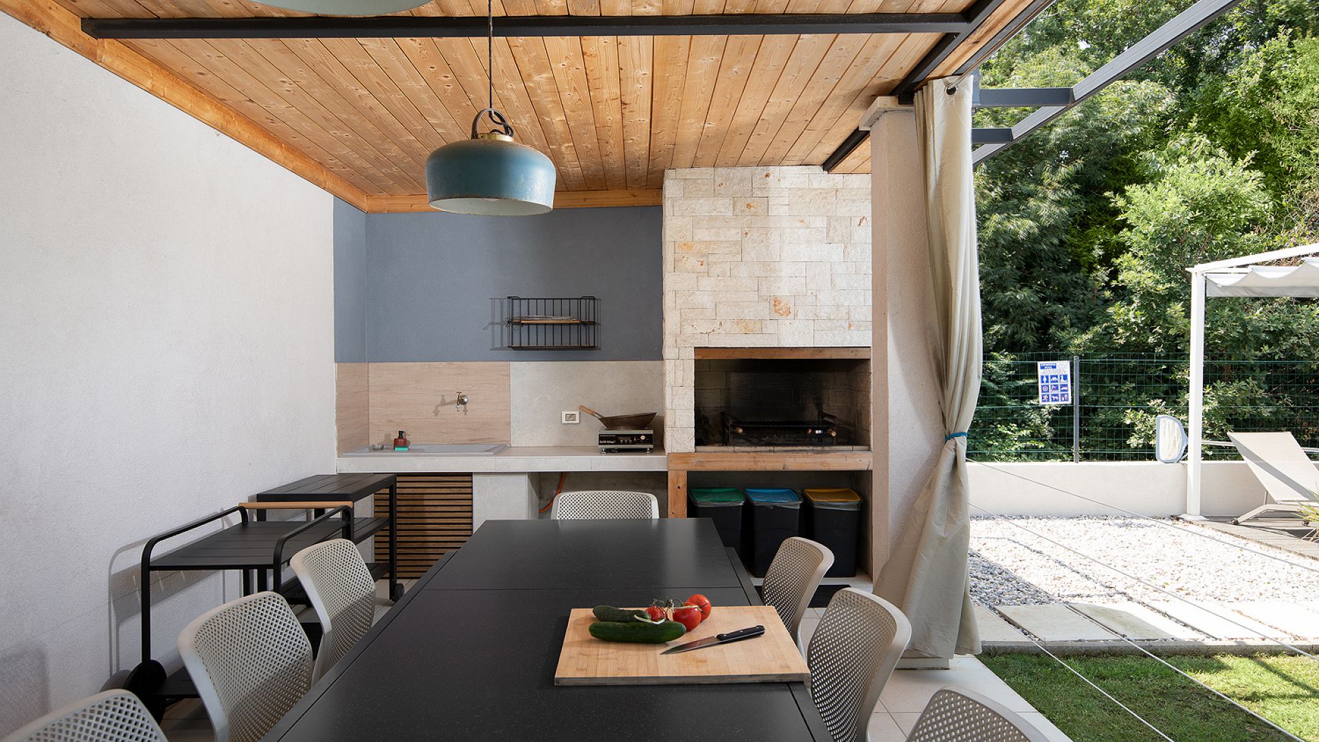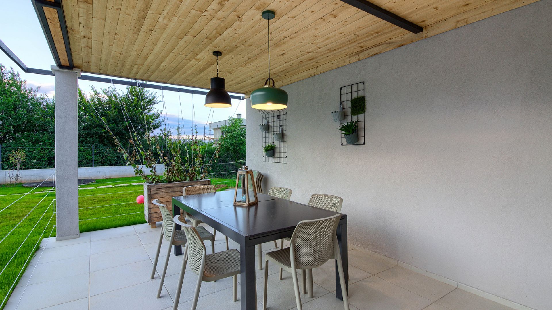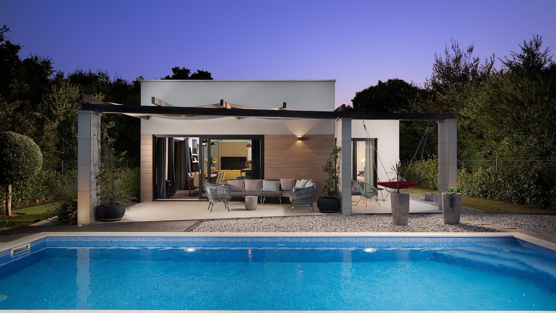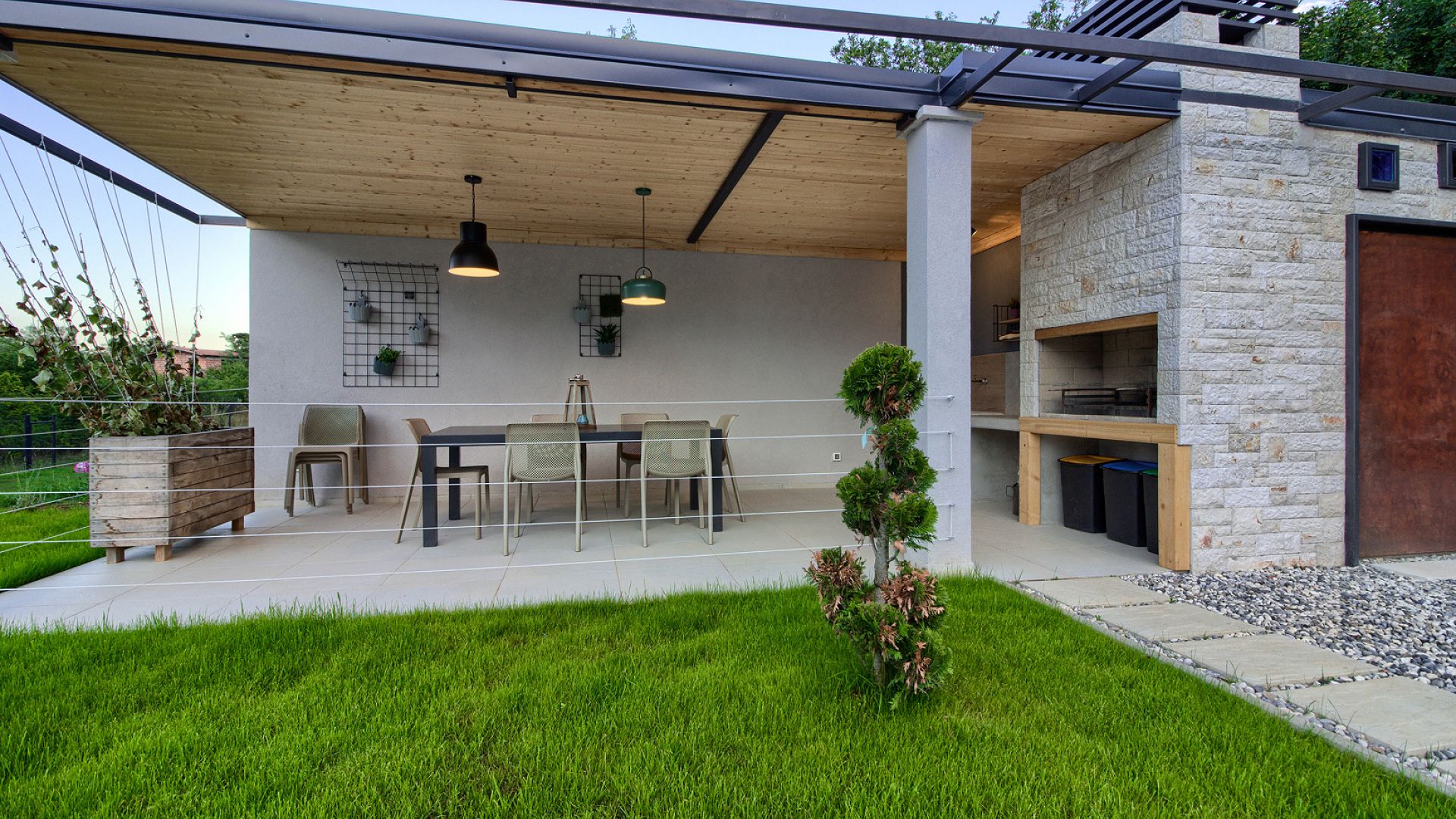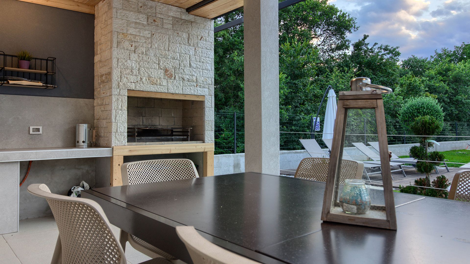 Будинок розміщений на просторій доглянутій території з садом і займає ділянку близько 2000 м². Архітектура сучасна, з акцентом на відкритий простір, світло та зручне зонування. Вілла комфортно приймає до 8–10 гостей.