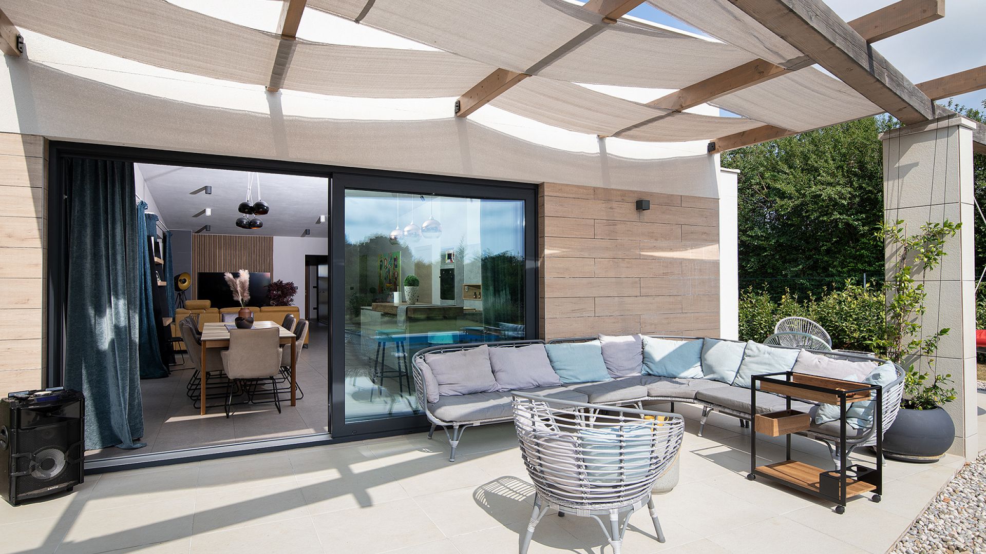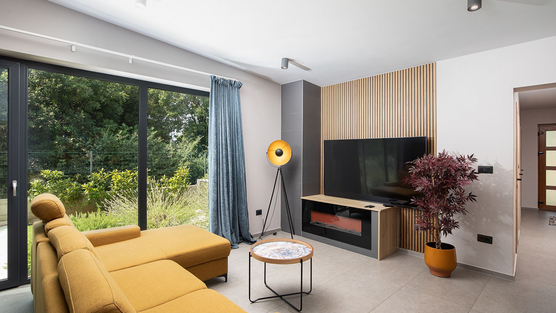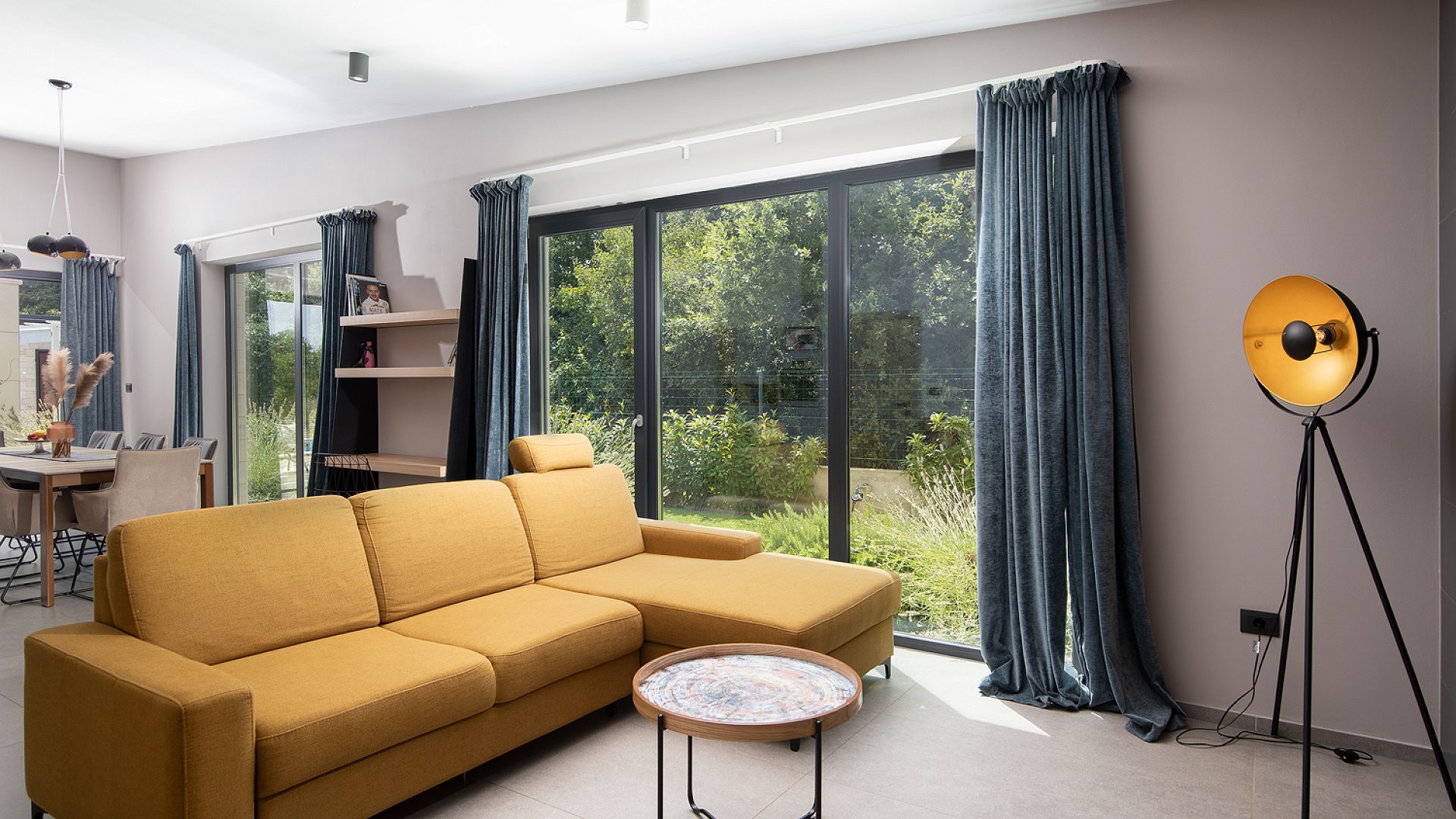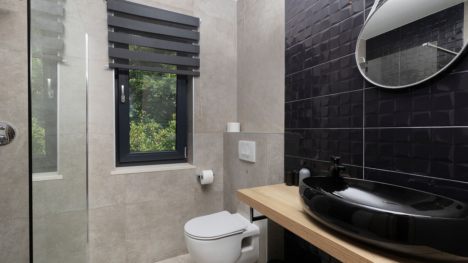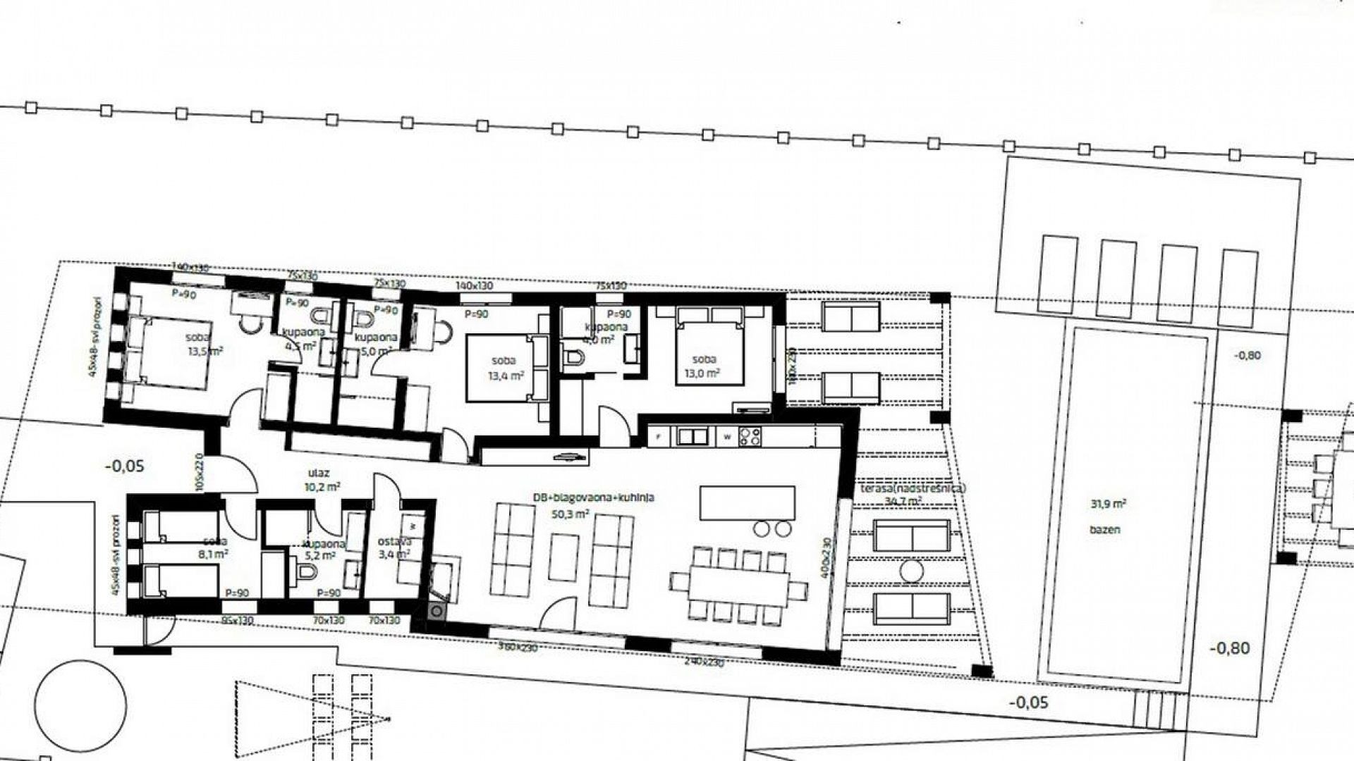 Будинок розміщений на просторій доглянутій території з садом і займає ділянку близько 2000 м². Архітектура сучасна, з акцентом на відкритий простір, світло та зручне зонування. Вілла комфортно приймає до 8–10 гостей.