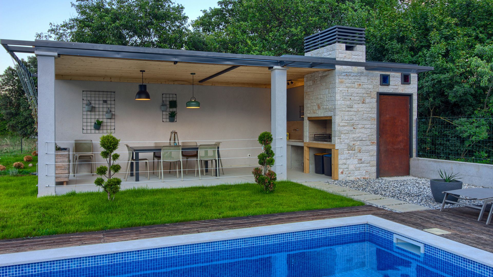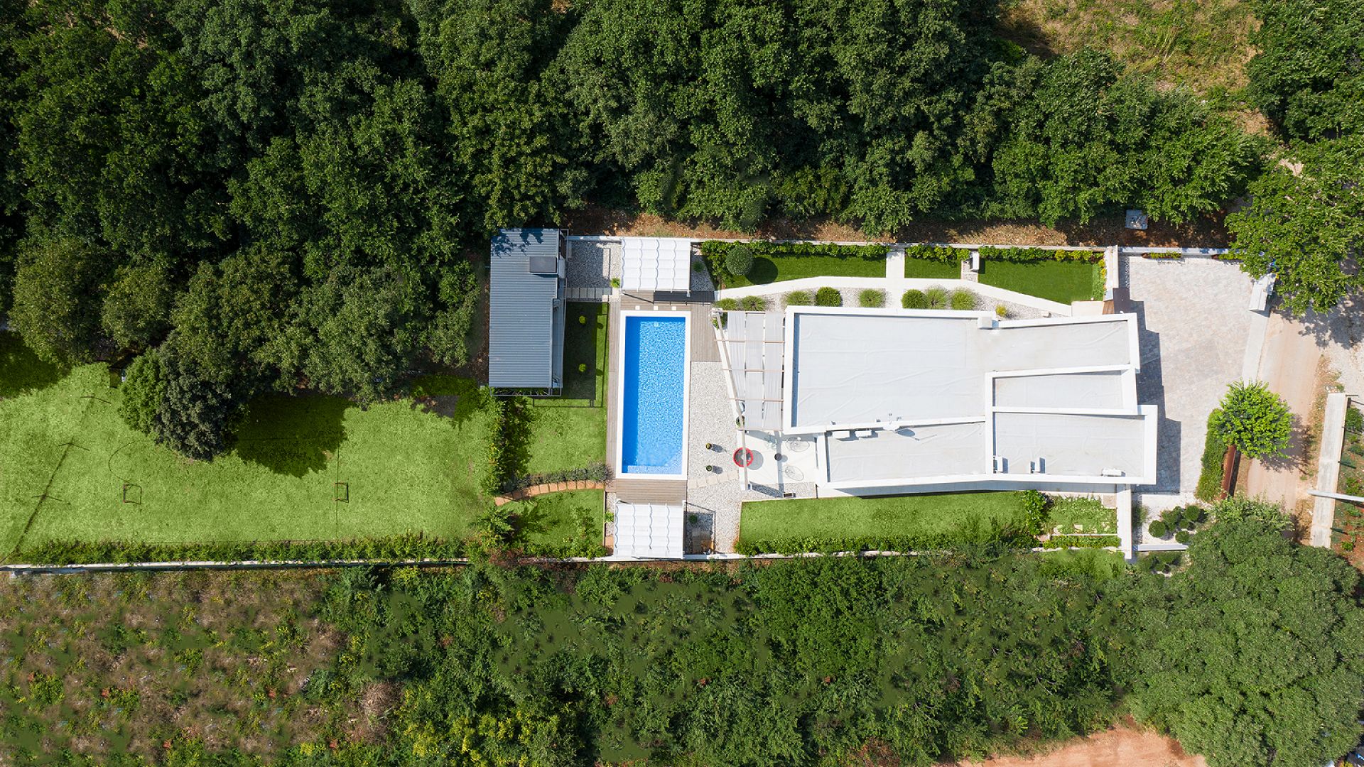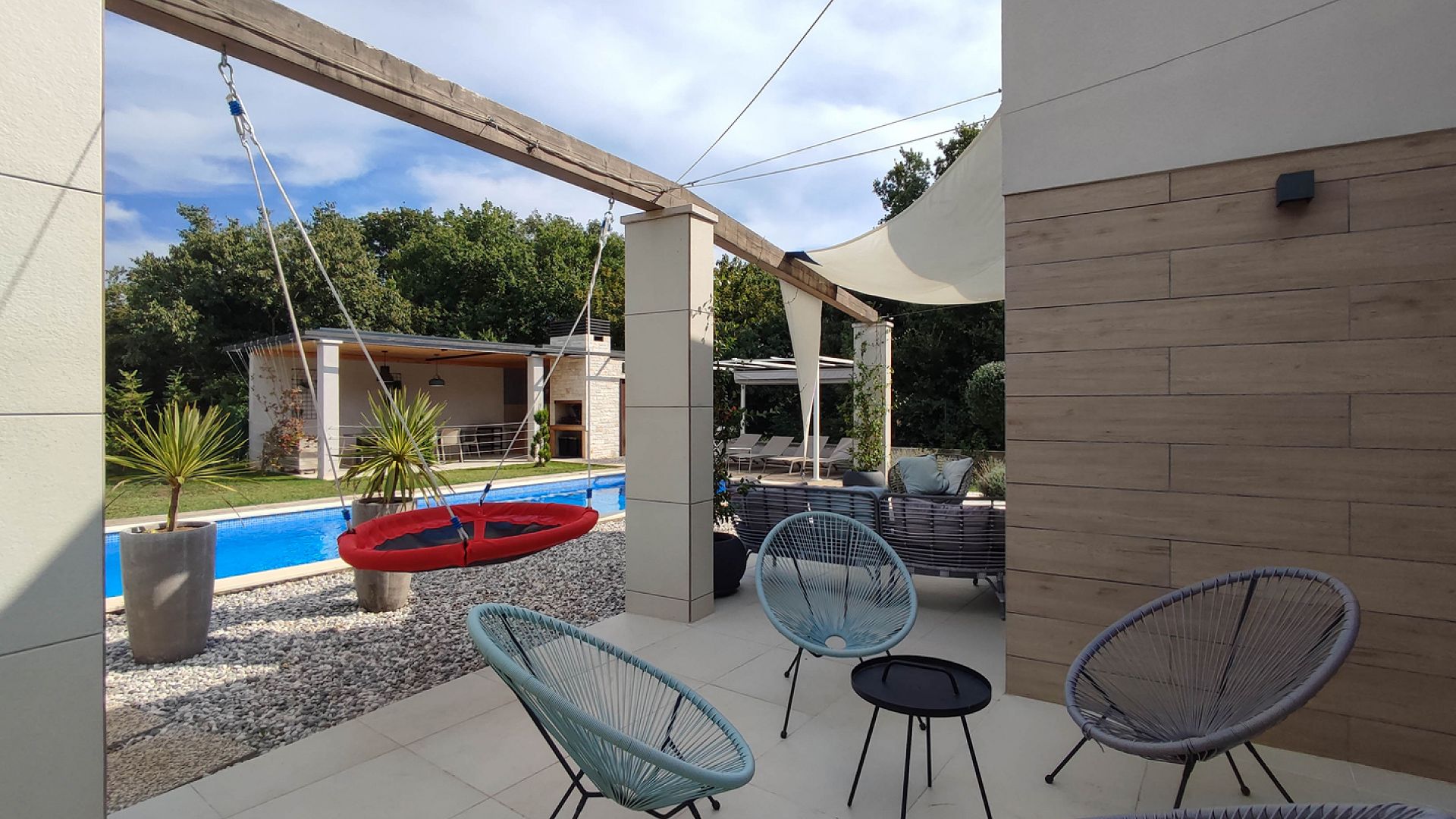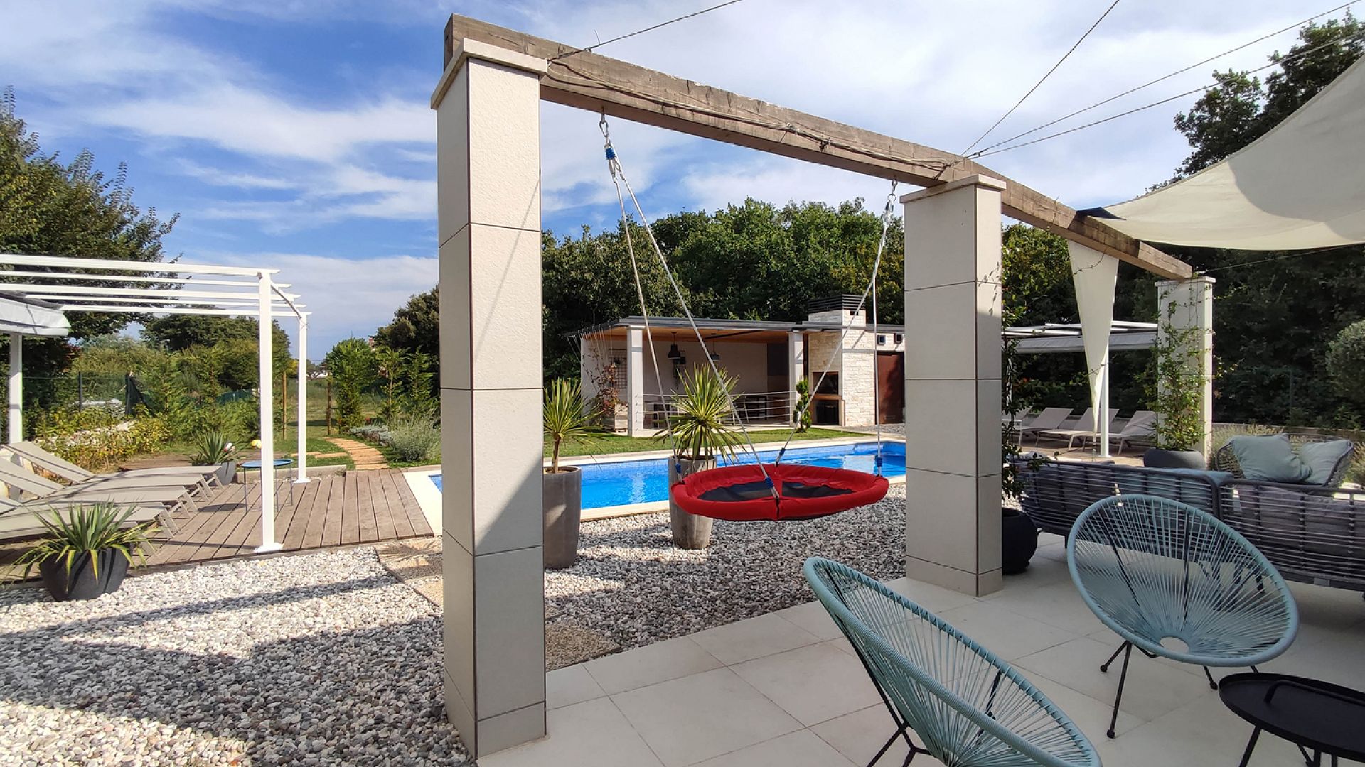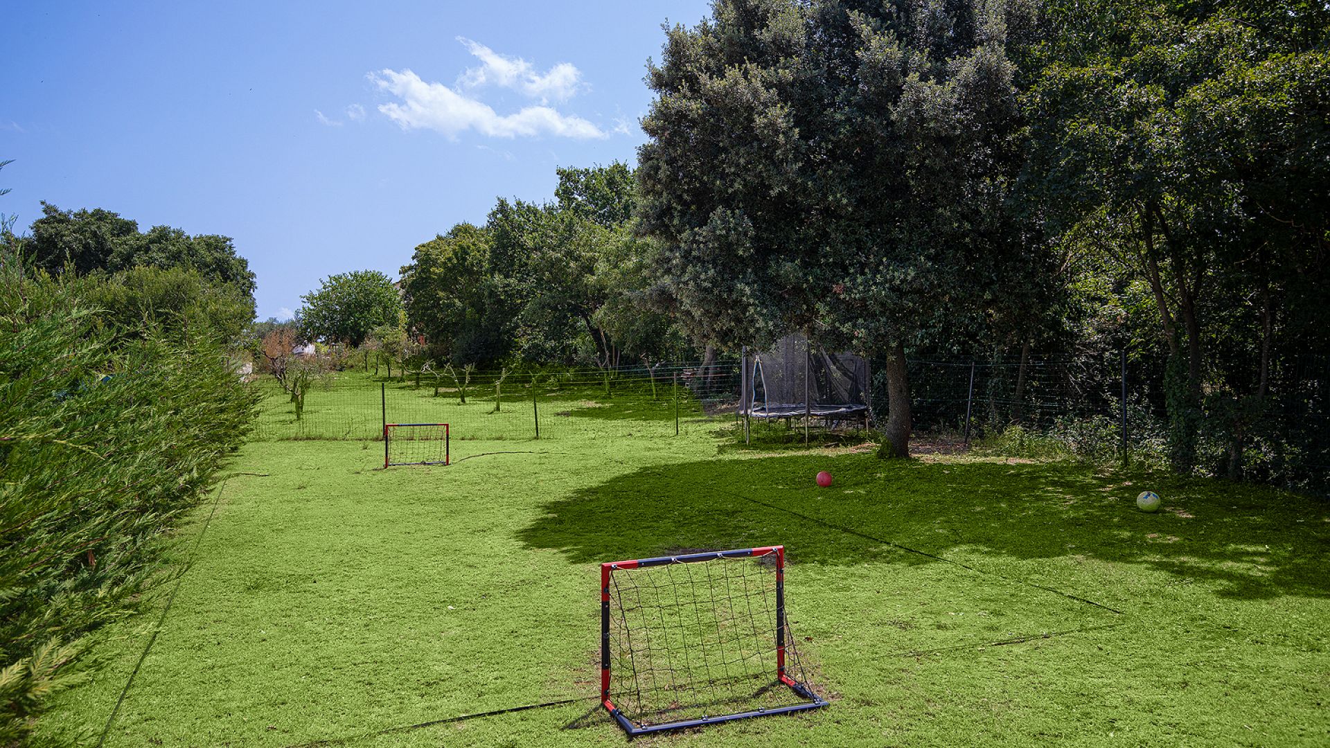 Зовнішній простір орієнтований на відпочинок і сімейний формат. Великий приватний басейн оточений зеленню та зоною для засмаги. На території передбачено кілька варіантів активностей: дитячий майданчик із гойдалками та батутом, міні-футбольне поле, зона для волейболу та інші розваги. Є тераса, зона барбекю та зовнішній душ. Паркування — до 4 автомобілів.