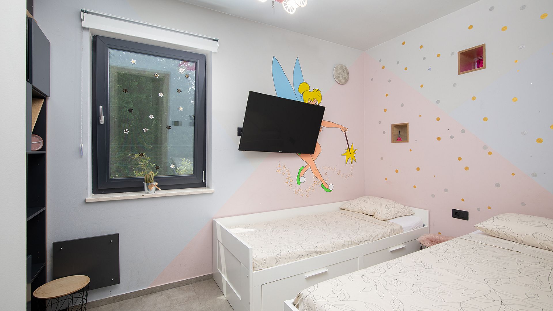 Усередині — чотири спальні, кожна з власною ванною кімнатою, кондиціонером і телевізором. Планування доповнює простора вітальня з м’якою зоною відпочинку та диваном-ліжком, що має прямий вихід на терасу та до басейну. Кухня сучасна, повністю обладнана, зручно поєднана як із внутрішнім простором, так і з відкритими зонами для обідів на свіжому повітрі.