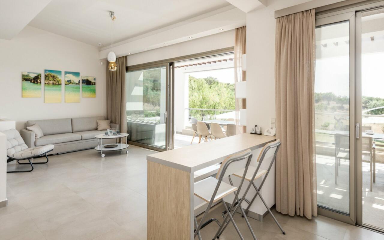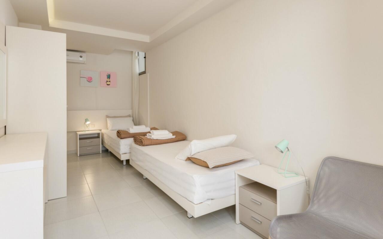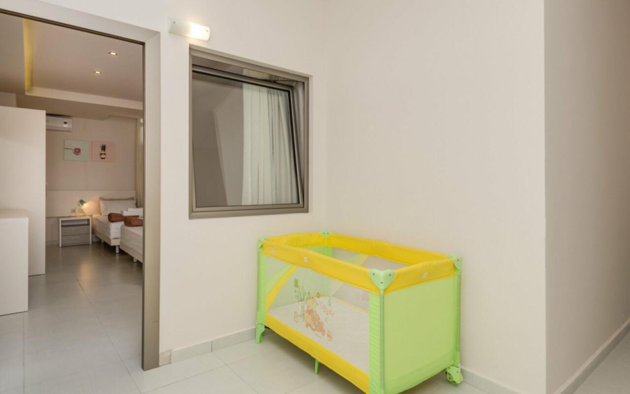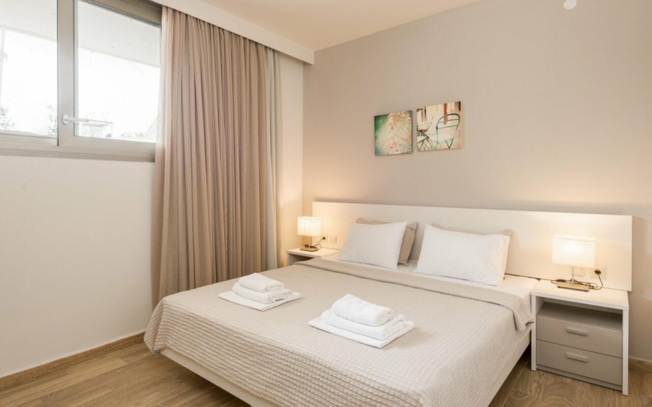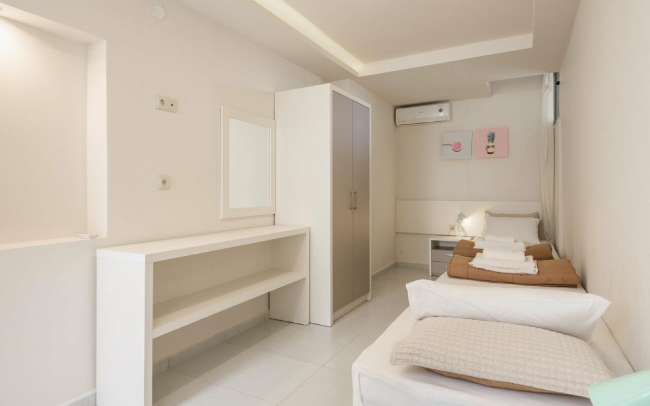 Три спальні забезпечують зручне розміщення: дві з двоспальними ліжками та одна з трьома односпальними — ідеально для сімей або компаній друзів. Великі вікна наповнюють простір природним світлом, а продумане планування створює відчуття легкості та простору.