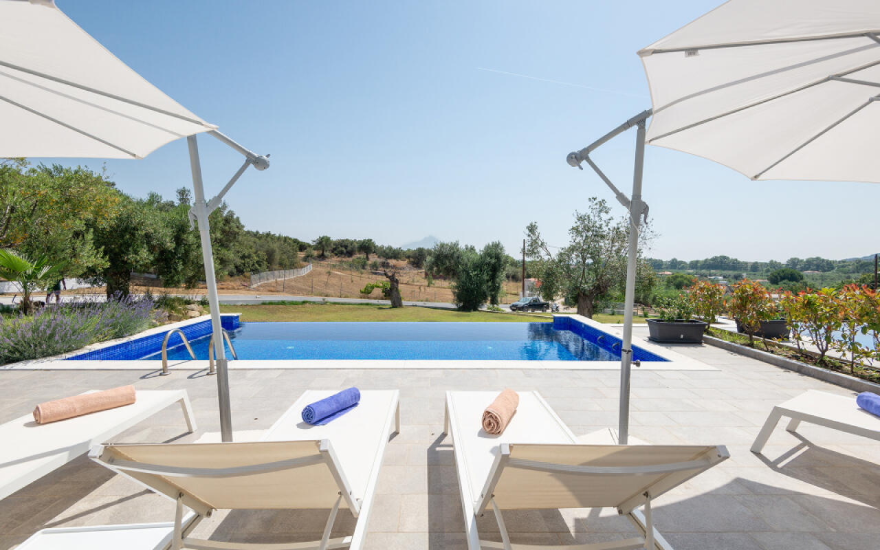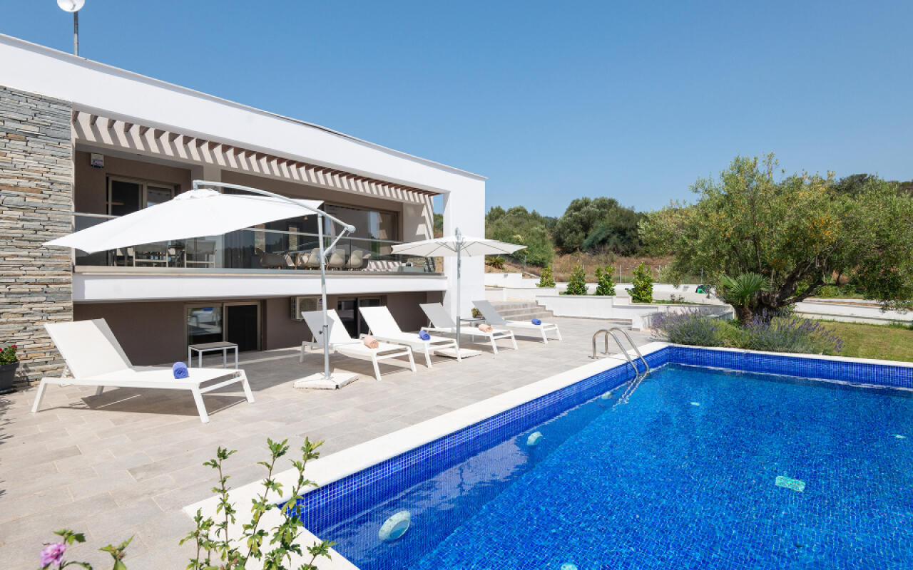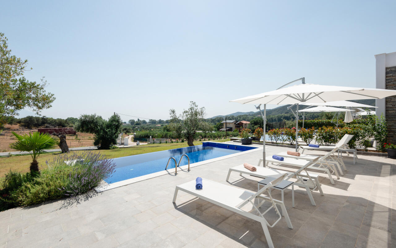 Приватний басейн із шезлонгами створює ідеальний простір для відпочинку під сонцем. Тераса з меблями та зона барбекю дозволяють проводити вечори на свіжому повітрі, насолоджуючись середземноморською атмосферою та краєвидами.