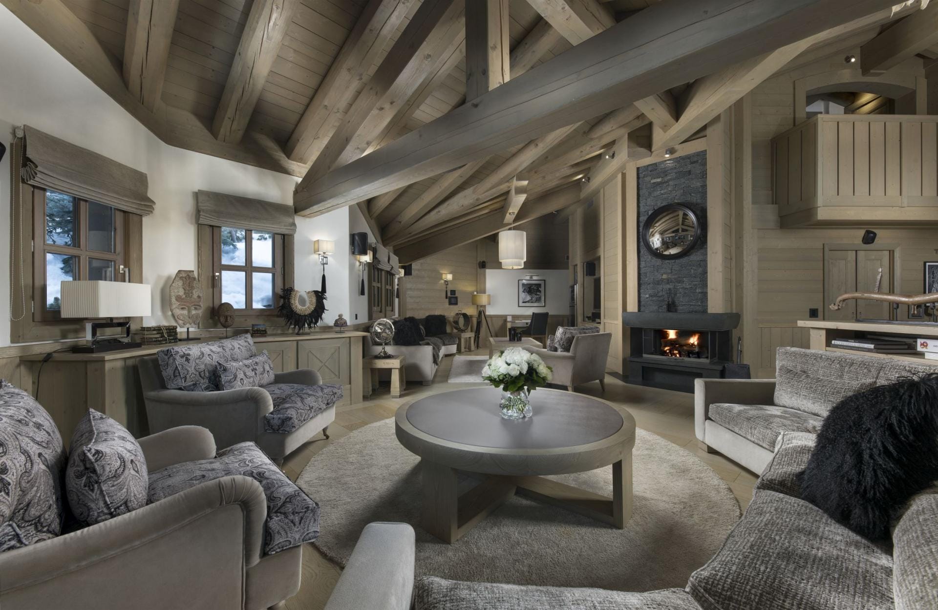 Основні житлові зони розташовані на другому рівні та вражають простором і світлом. Високі стелі з дерев’яними балками та центральний камін формують атмосферу тепла і комфорту.