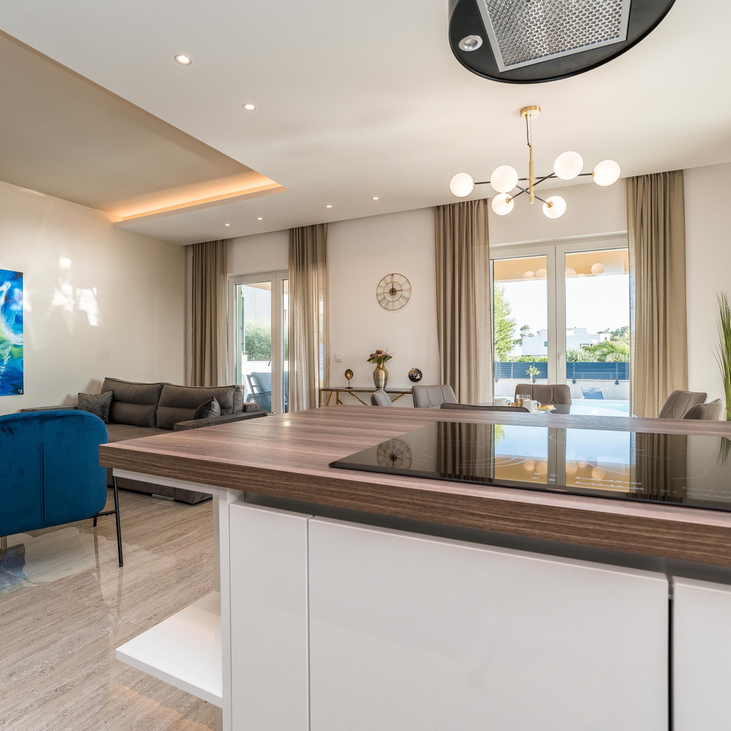 Загальна площа становить 198 м². У будинку — три спальні, кожна з власною ванною кімнатою, а також окремий туалет. На першому поверсі розташовані сучасна вітальня з великими вікнами, повністю обладнана кухня, їдальня та спальня з ванною. Дві інші спальні — на верхньому рівні, обидві з чудовим видом і приватними санвузлами. Усі кімнати мають телевізори та кондиціонери.