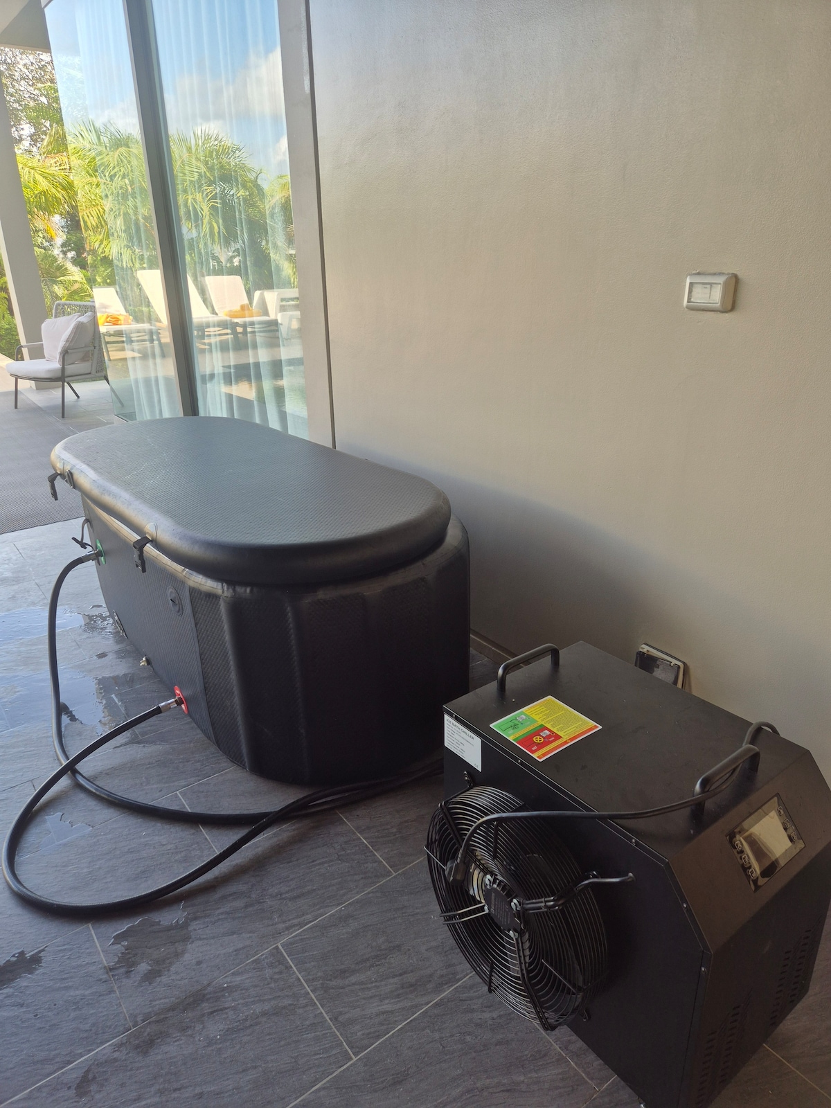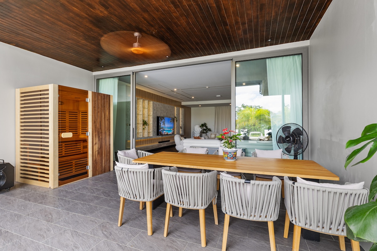 На території — басейн 13×4 м, оточений тропічним садом і зонами відпочинку з шезлонгами. Під навісом розташована обідня зона просто неба, а також обладнано місце для барбекю. Під час вечора територію освітлює м’яке підсвічування, створюючи романтичну атмосферу.