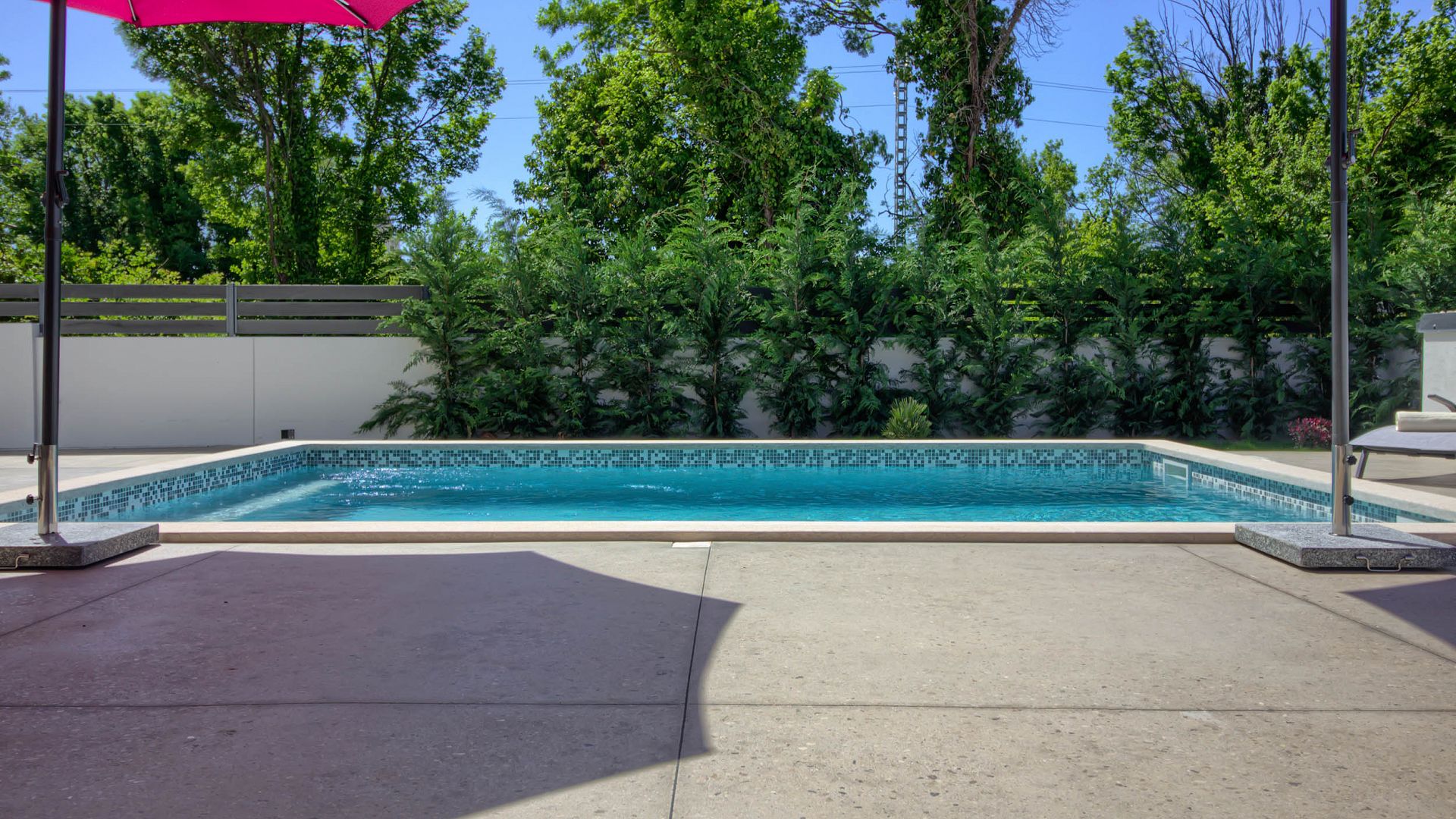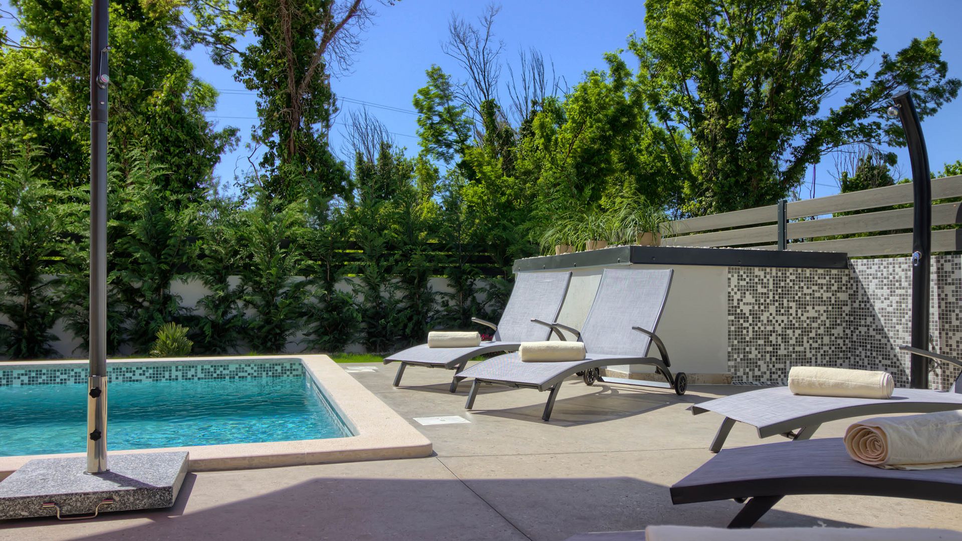 Зовнішній простір — одна з ключових переваг цієї вілли. Доглянутий сад оточує великий басейн із окремою мілкою зоною для дітей. Тут легко провести весь день: засмагати на шезлонгах, відпочивати в тіні або вечеряти на терасі. Є барбекю та зовнішній душ. Приватне паркування доступне на території.