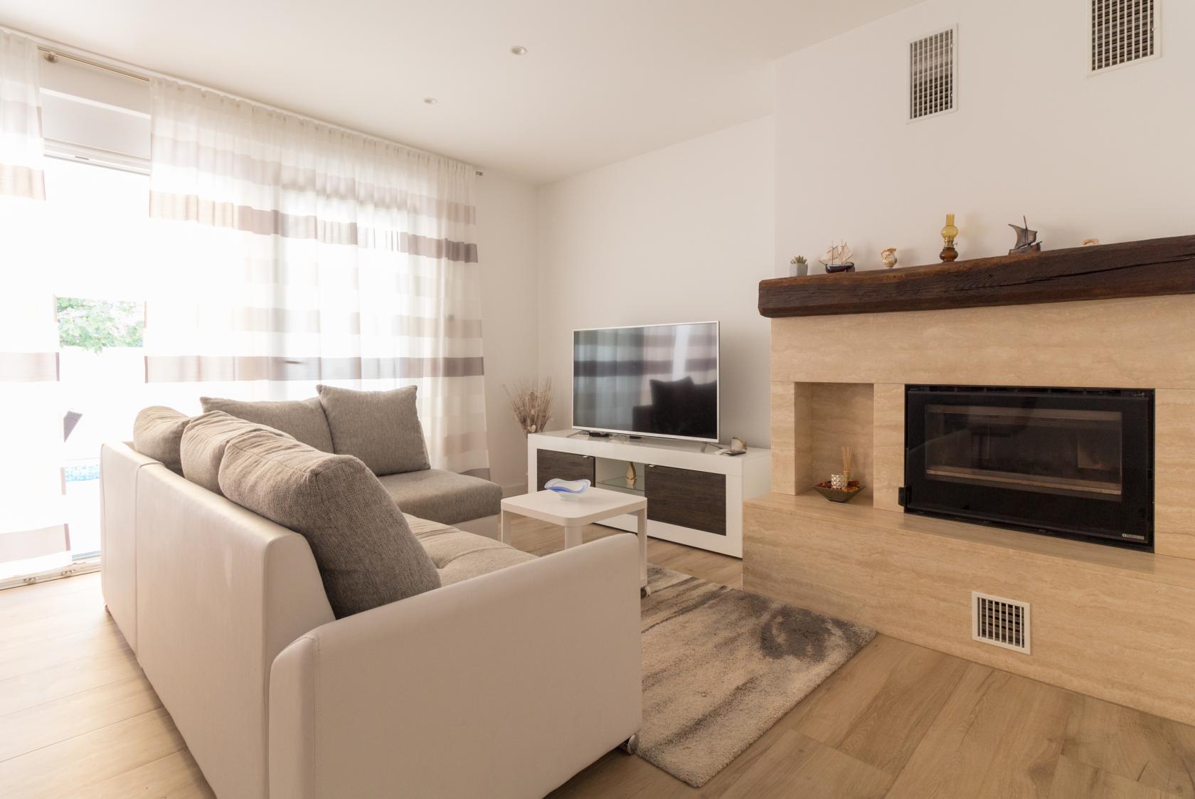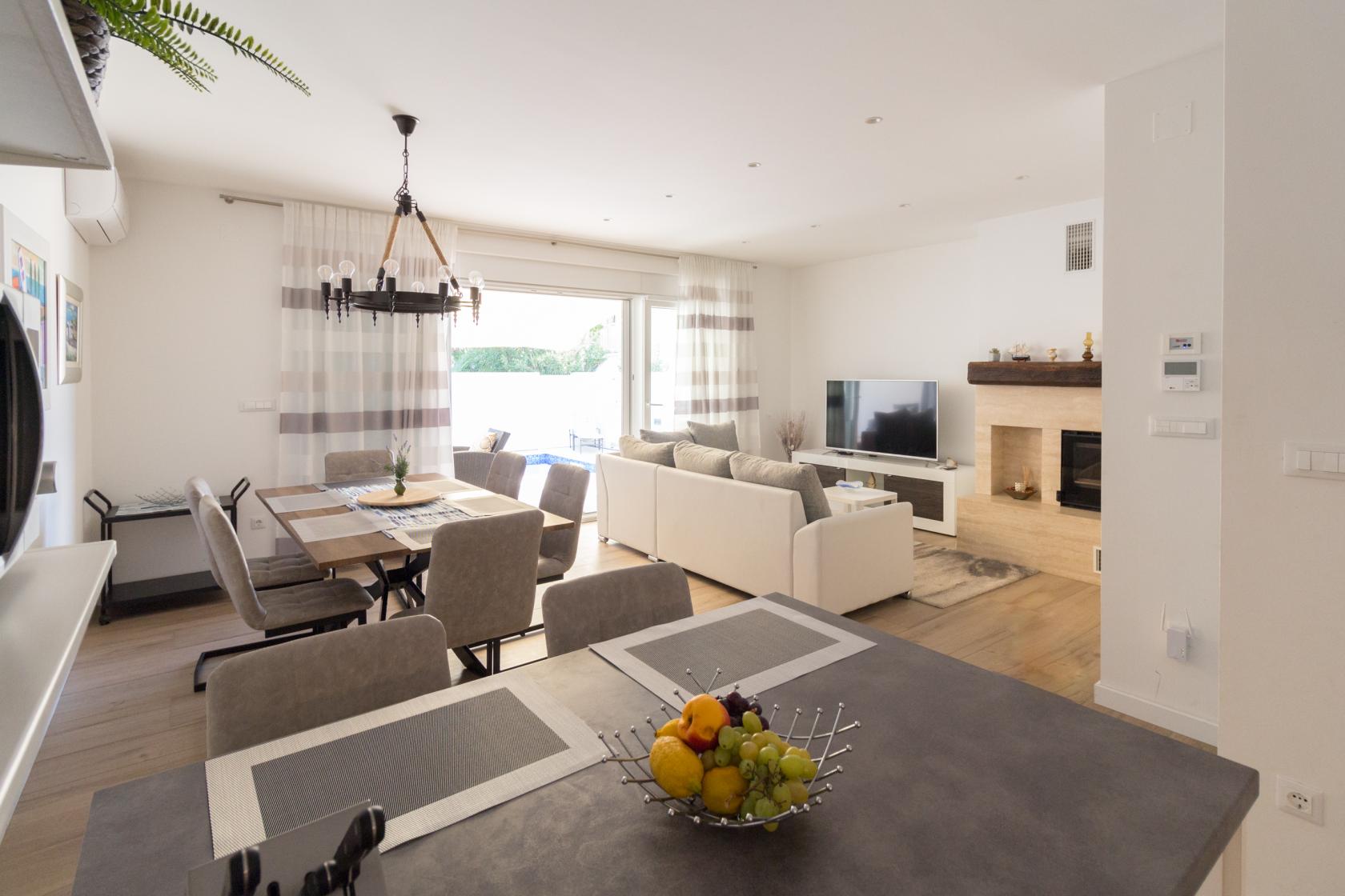 Інтер’єри світлі, сучасні та функціональні. Вітальня з каміном поєднана з обідньою зоною та повністю обладнаною кухнею з усією необхідною технікою для комфортного приготування їжі. Панорамні вікна відкривають простір назовні, наповнюючи будинок світлом і створюючи природний зв’язок між інтер’єром і терасою.