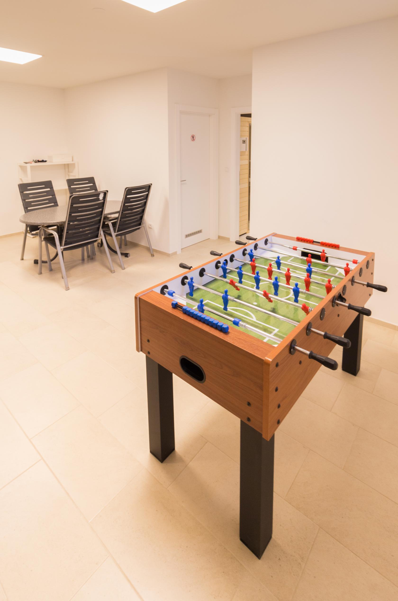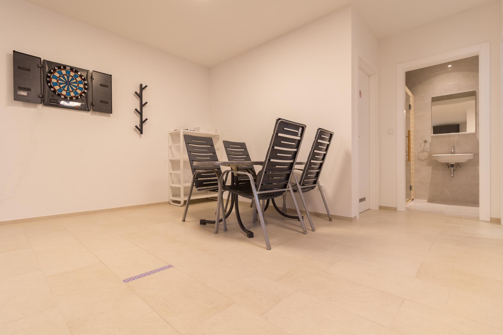 Будинок повністю огороджений і забезпечує максимальний рівень комфорту та усамітнення. Просторий двір із приватним підігрівним басейном, критою терасою та зоною відпочинку створює атмосферу справжнього курорту, де приємно проводити час з ранку до пізнього вечора. Для активного дозвілля передбачені сауна, невеликий тренажерний зал, настільний теніс, дартс та зона барбекю на дровах.