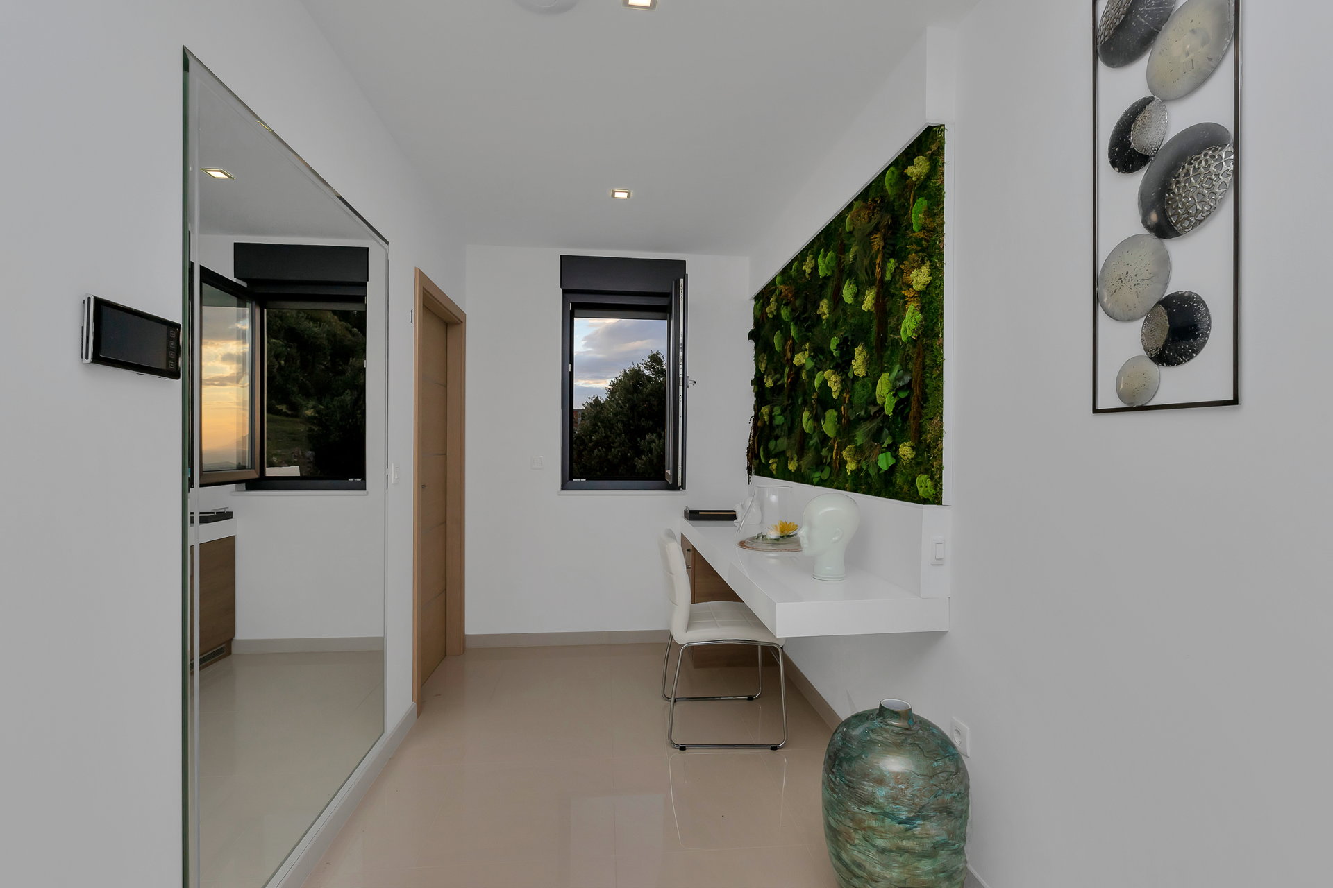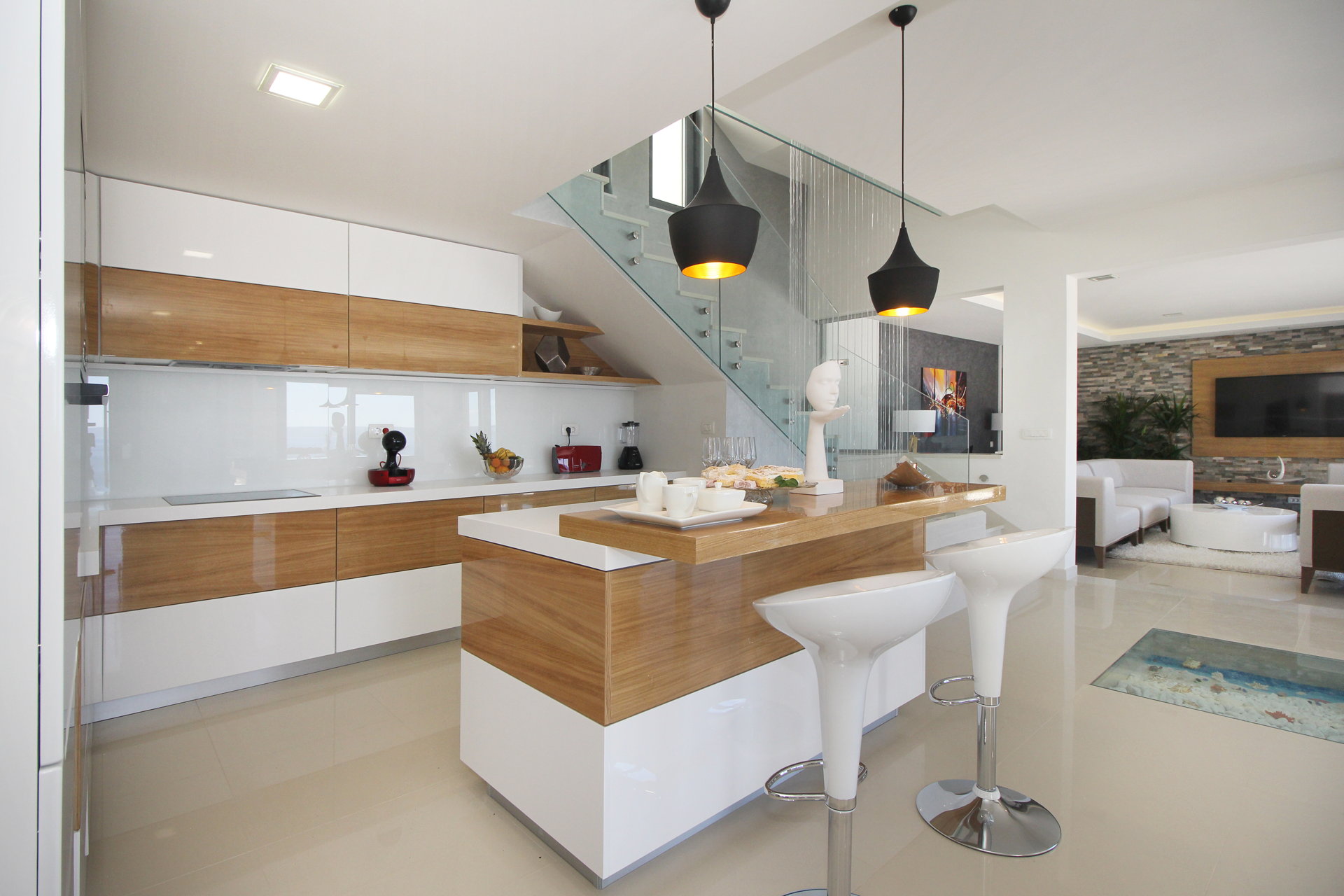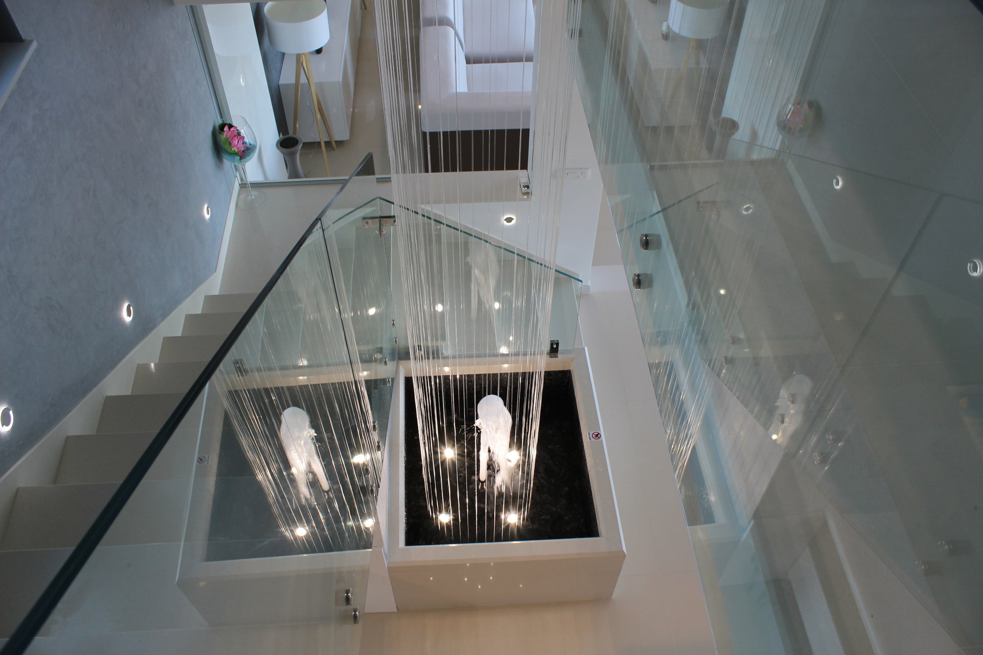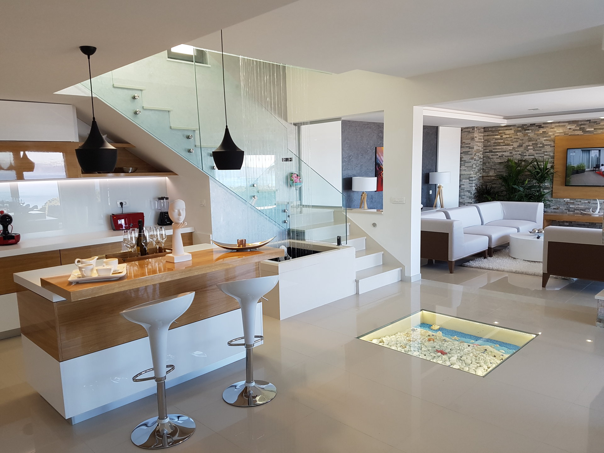 Простора вітальня, стильна кухня та їдальня формують відкриту житлову зону, в центрі якої розташований декоративний фонтан, що створює спокійну, релаксуючу атмосферу.