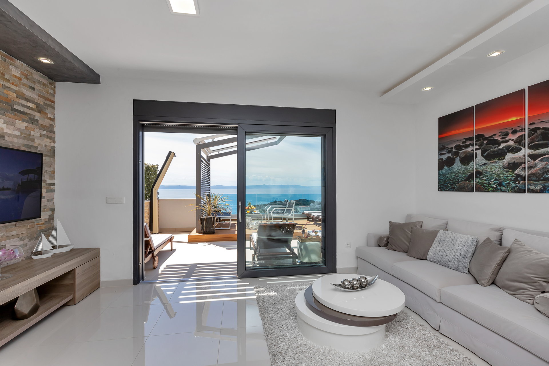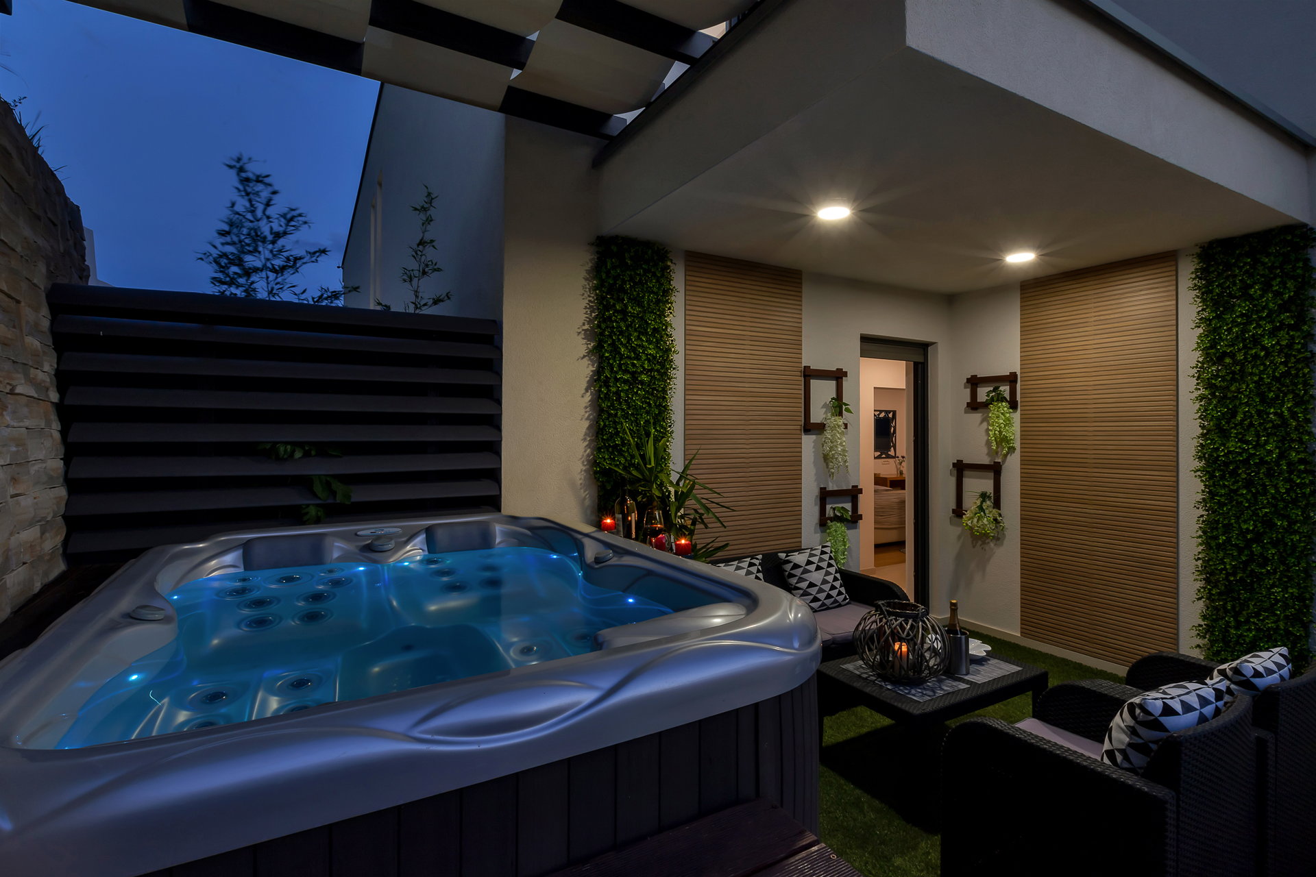 Дві тераси оснащені джакузі, звідки відкривається захопливий краєвид на море та захід сонця.