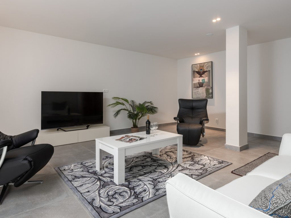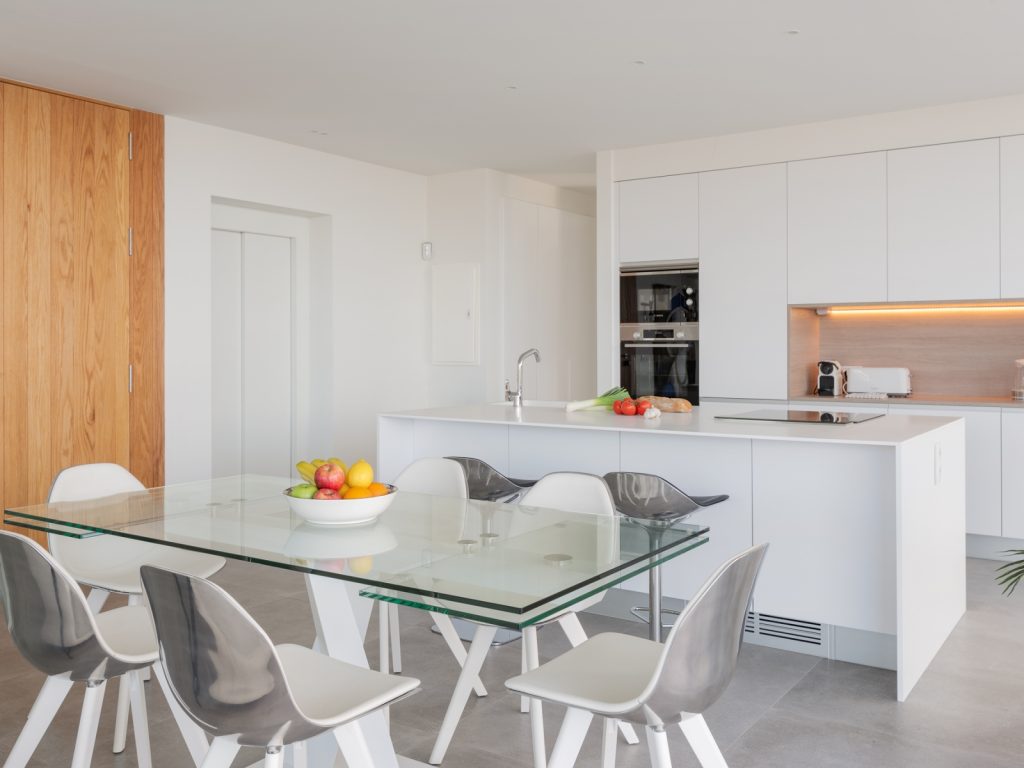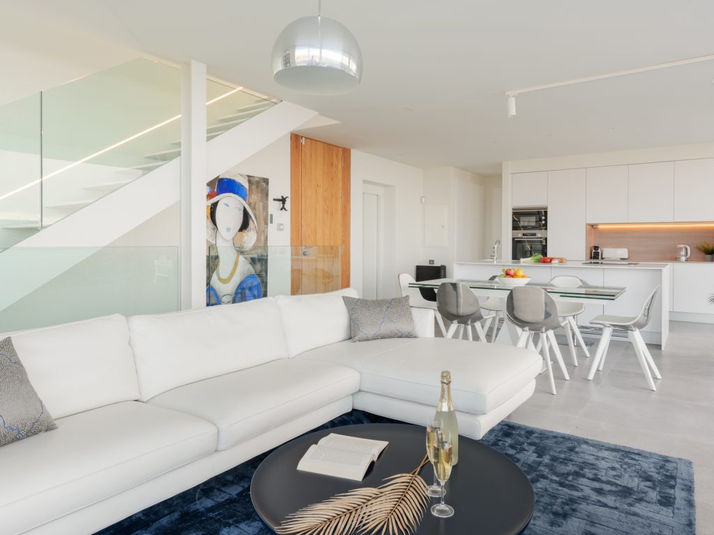 Центром будинку є простора вітальня з великим диваном та зоною відпочинку, де приємно проводити вечори після дня на пляжі. Поруч розташована повністю обладнана дизайнерська кухня з усією необхідною технікою та кухонним приладдям. З житлових приміщень є вихід на мебльовану терасу — ідеальне місце для сніданків на свіжому повітрі або неспішних вечерь на заході сонця.
