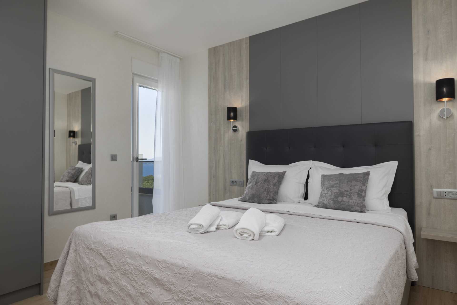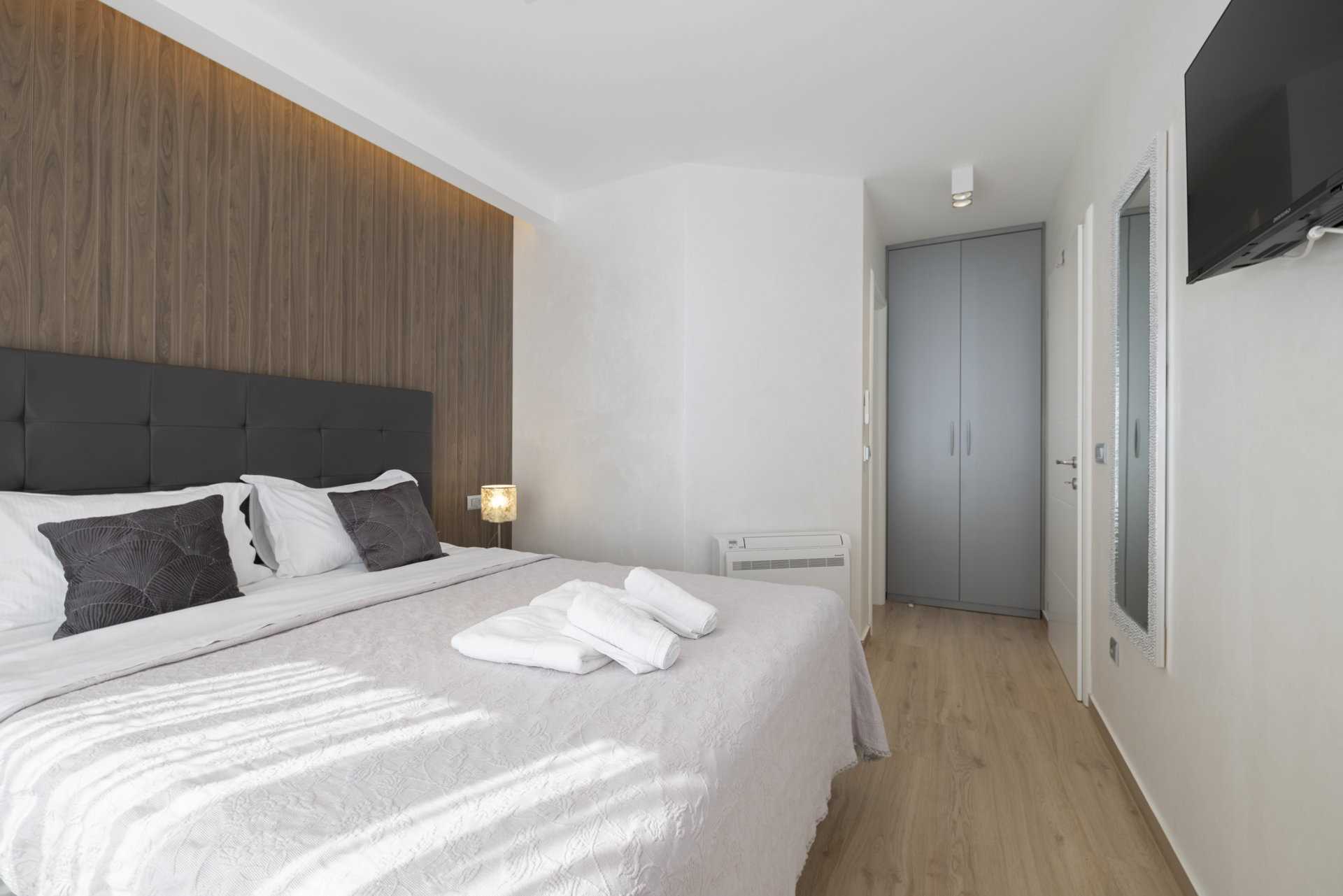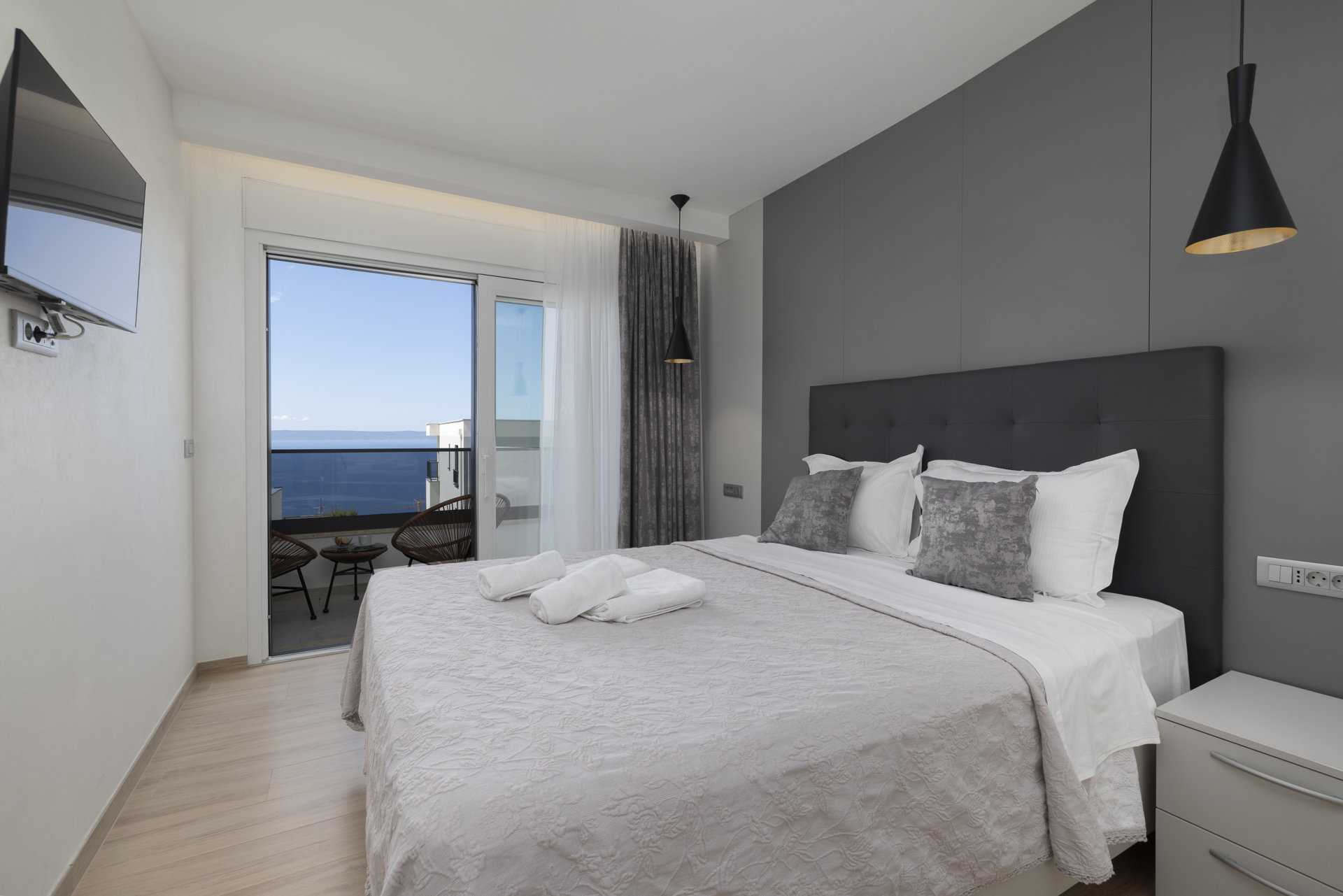 - Спальня 1: двоспальне ліжко, власна ванна кімната, вид на море