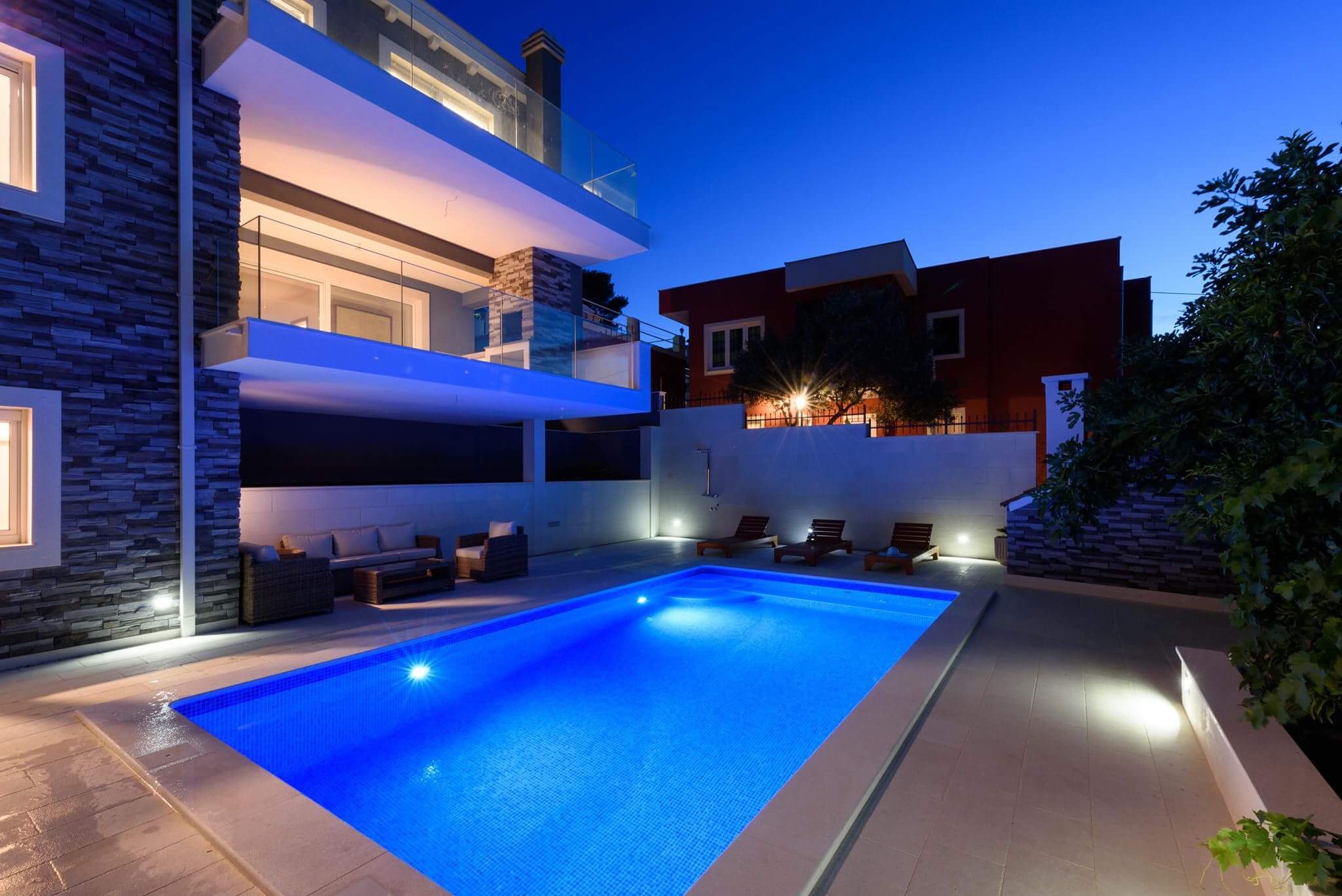 Елегантна вілла розташована на острові Чіово, лише за кілька кроків від моря, поруч із історичним містом Трогір. Локація поєднує спокій острівного відпочинку з легким доступом до культурних пам’яток, ресторанів та морських розваг.