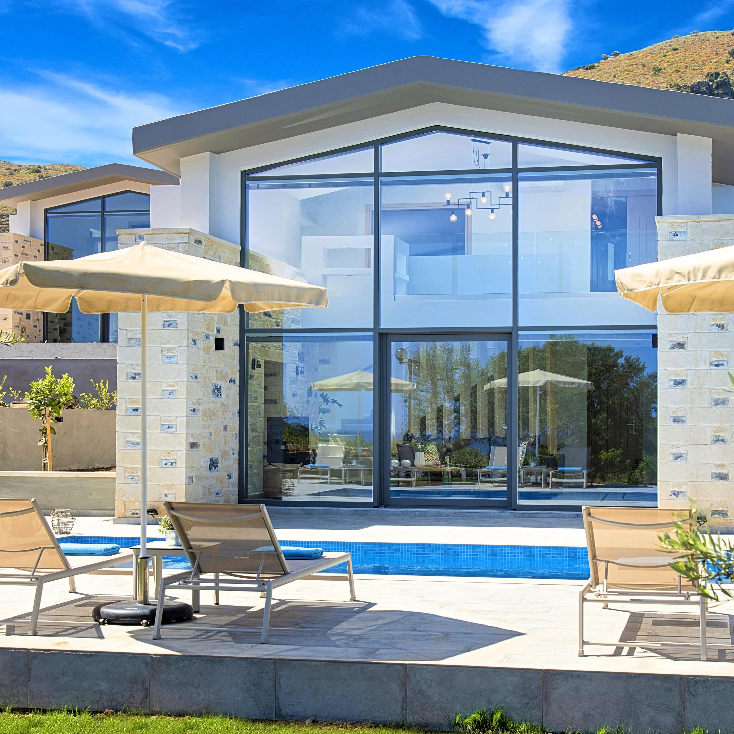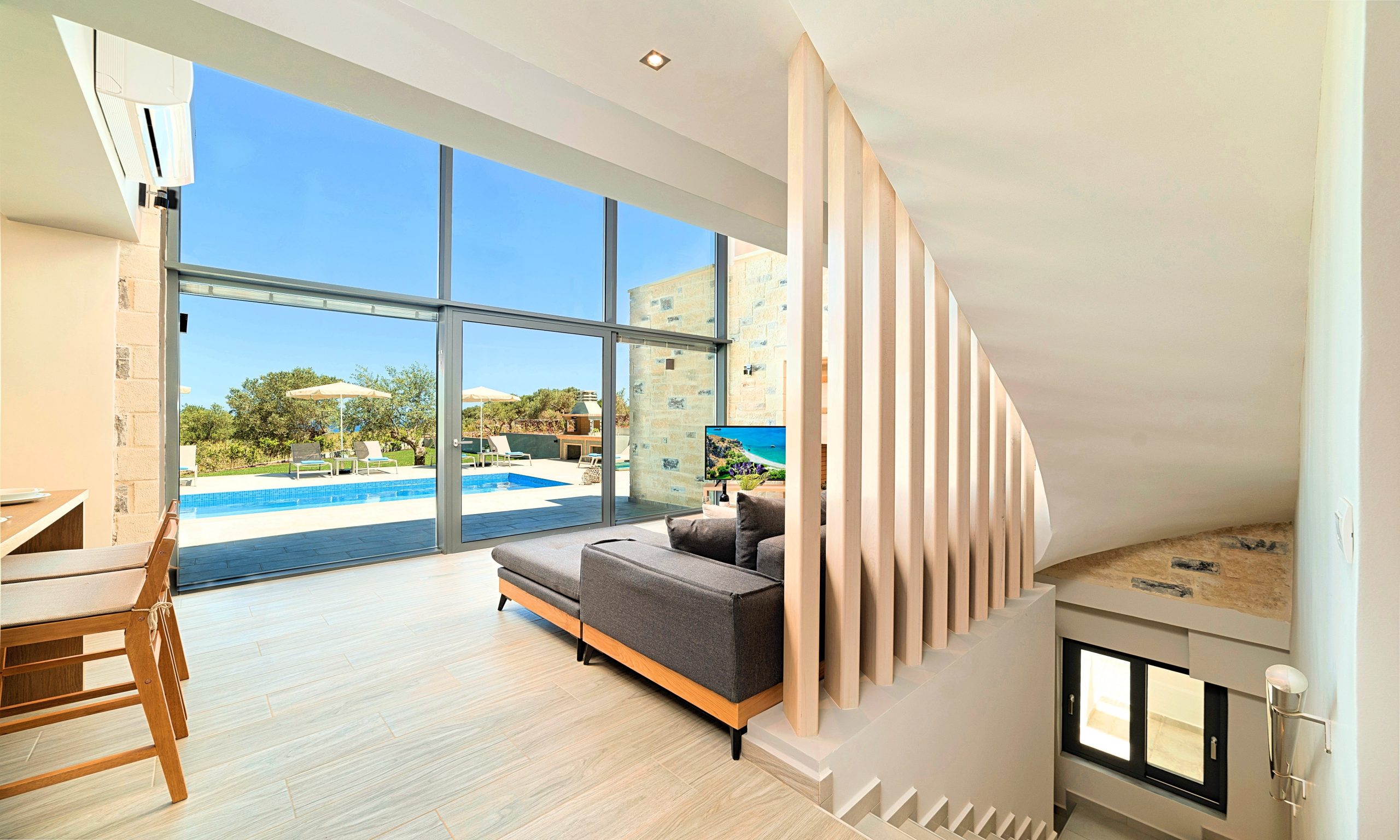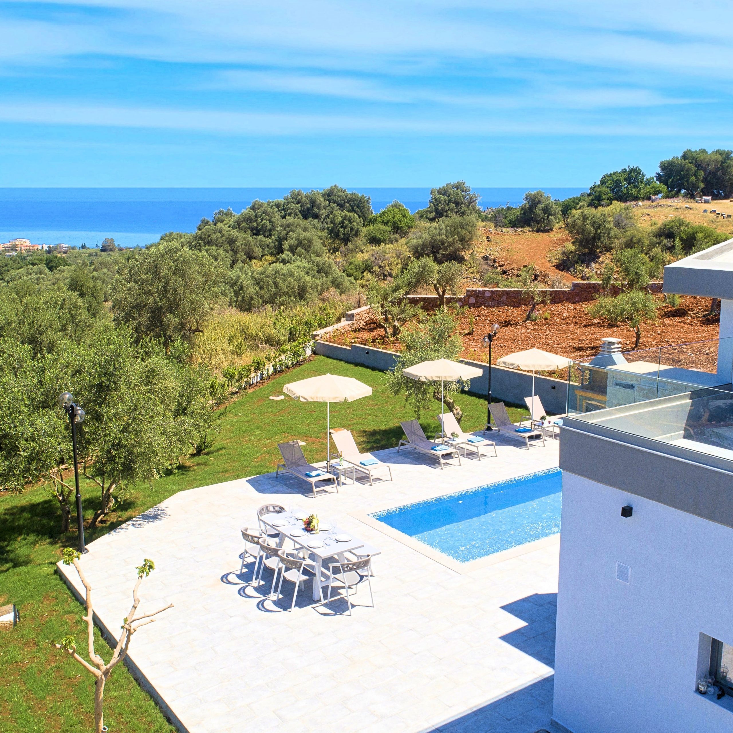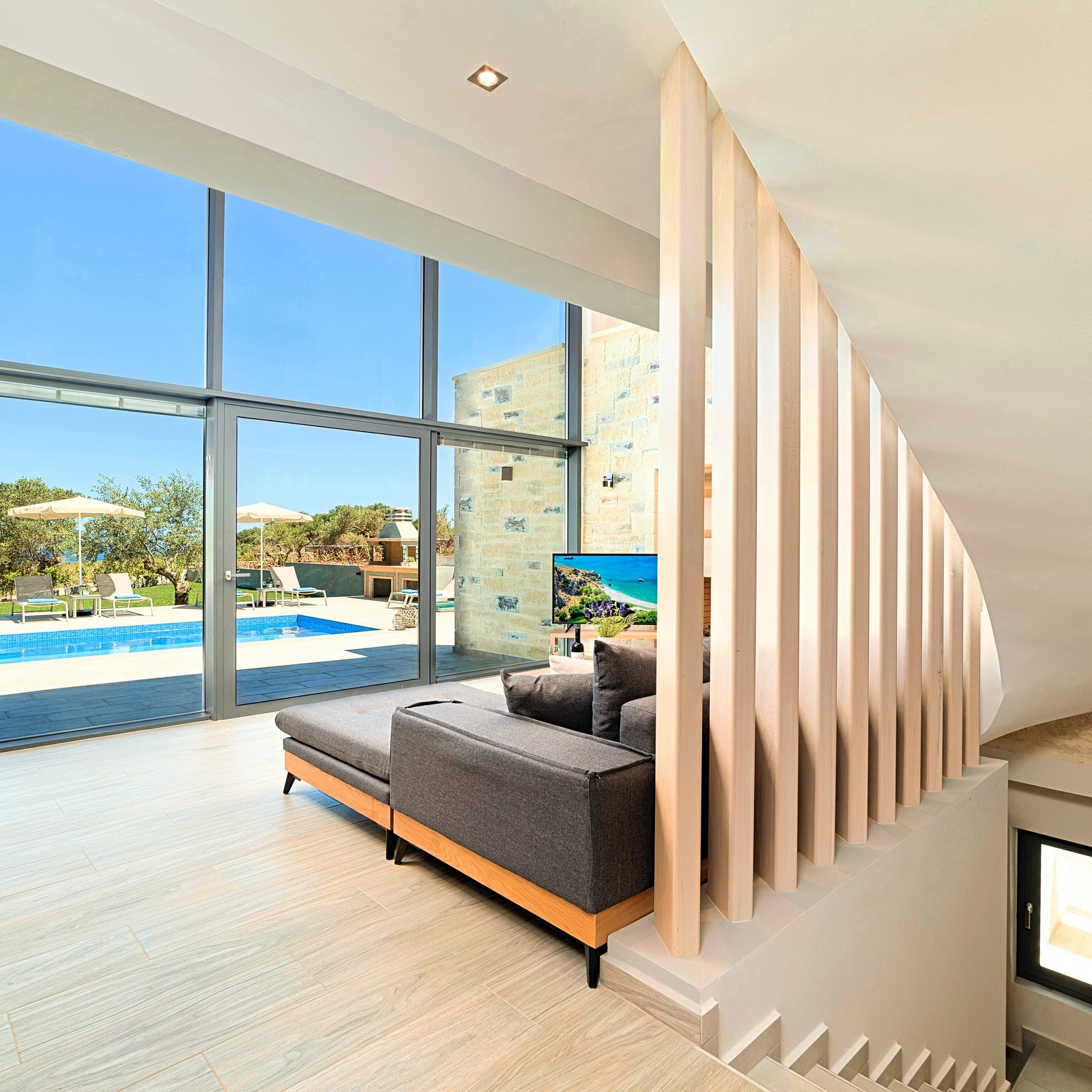 Розташована серед оливкового гаю над піщаним узбережжям, ця вілла дарує відчуття усамітнення, гармонії з природою та захоплюючі панорамні краєвиди на Критське море. Архітектура комплексу створена амфітеатрально, завдяки чому з кожної точки відкривається мальовничий вид, а простір наповнений світлом і середземноморською атмосферою.