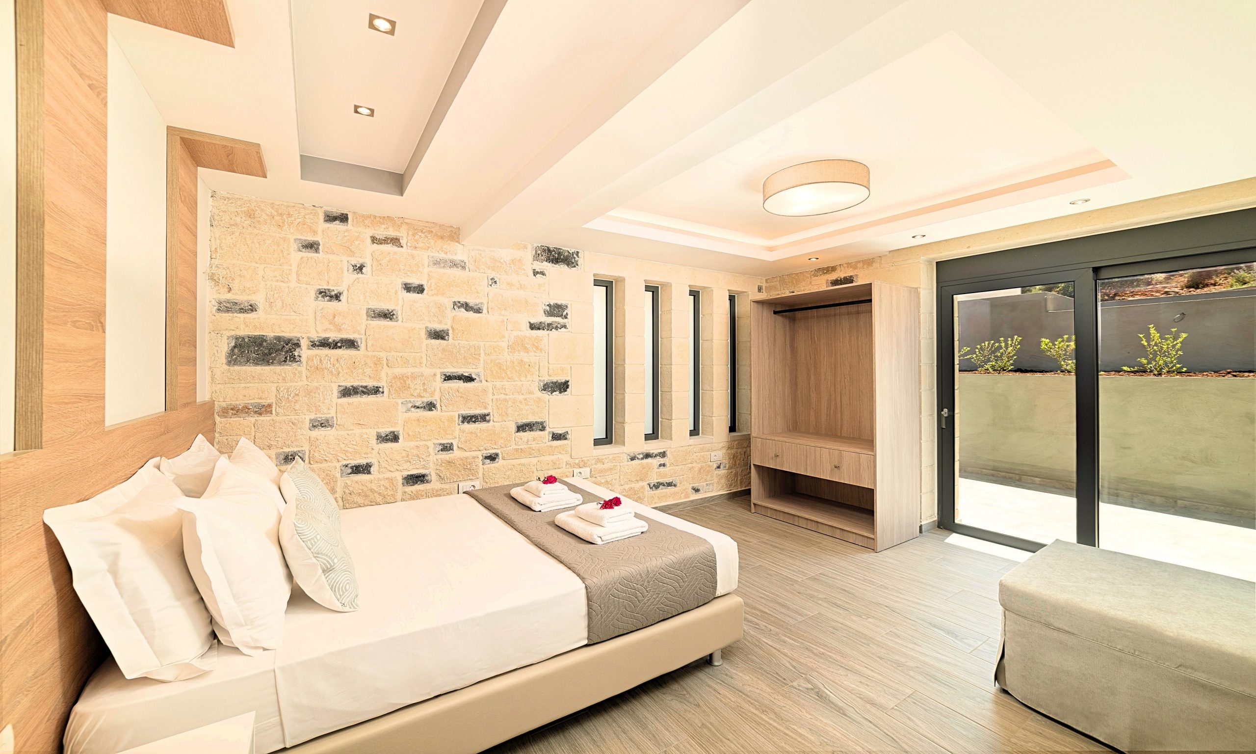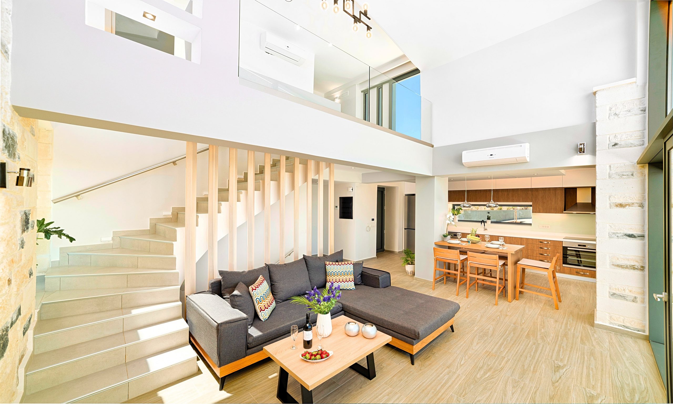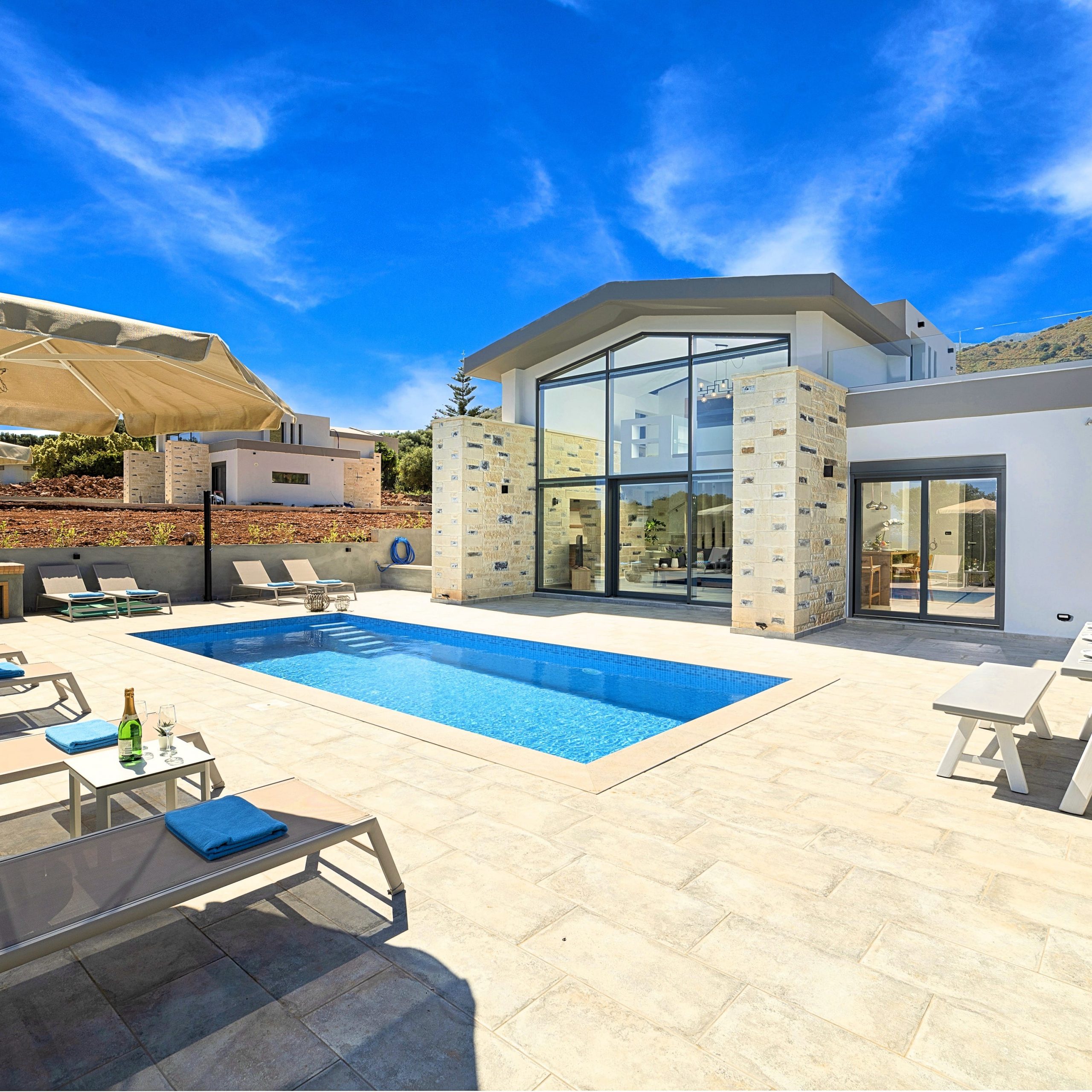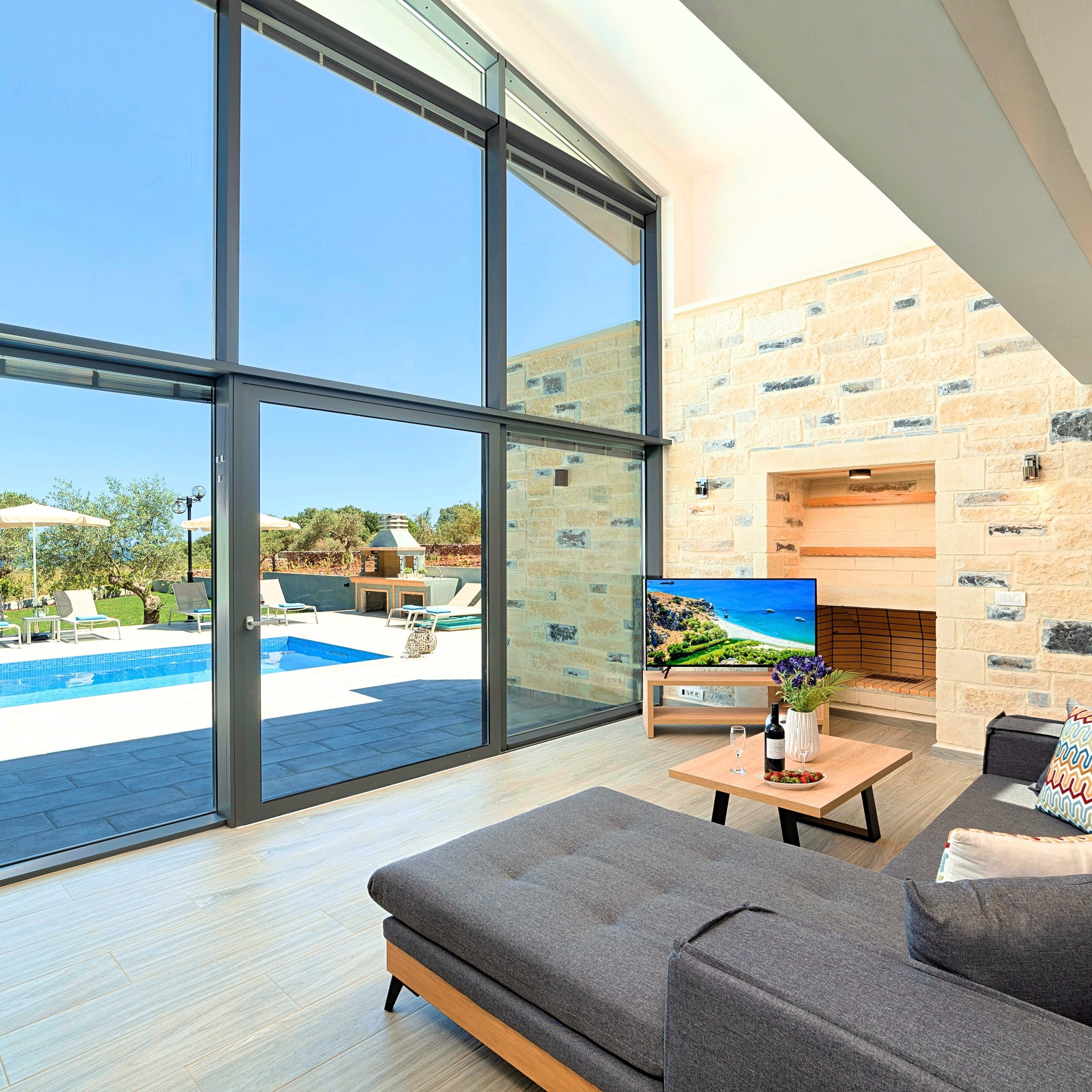Розташована серед оливкового гаю над піщаним узбережжям, ця вілла дарує відчуття усамітнення, гармонії з природою та захоплюючі панорамні краєвиди на Критське море. Архітектура комплексу створена амфітеатрально, завдяки чому з кожної точки відкривається мальовничий вид, а простір наповнений світлом і середземноморською атмосферою.