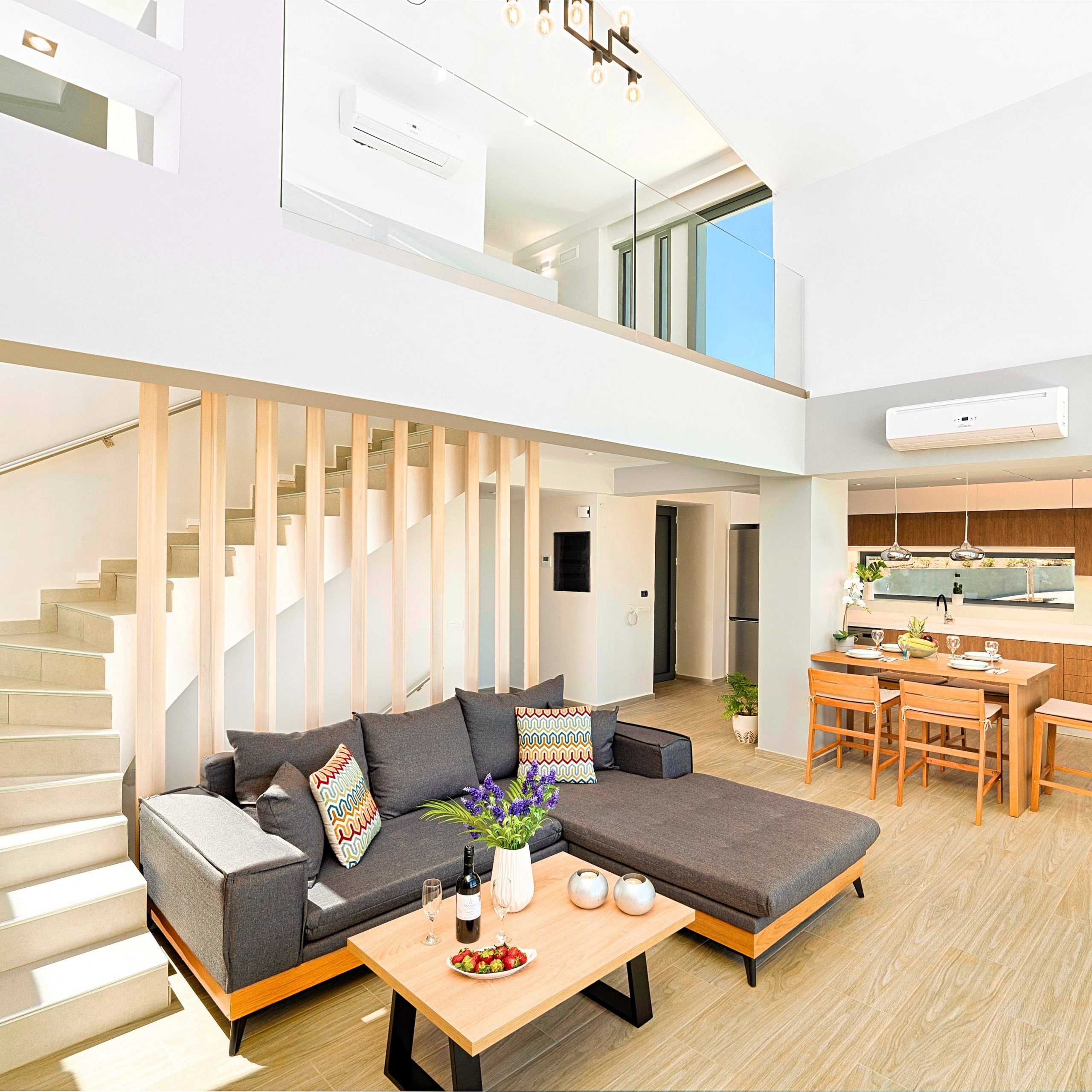 Інтер’єр поєднує елегантність і комфорт: продумані деталі, спокійна кольорова гама та просторі зони відпочинку створюють ідеальні умови для релаксу. Вілла підходить як для великих сімей, так і для компаній друзів, адже може розмістити до 15 гостей, з них 10 — у спальнях, а додаткові місця передбачені у лаунж-зонах.