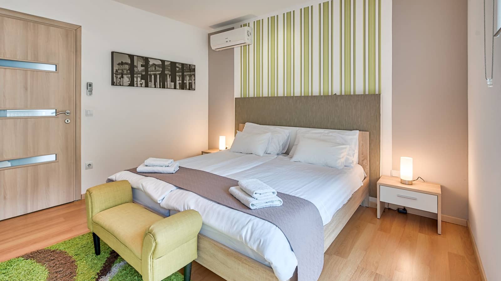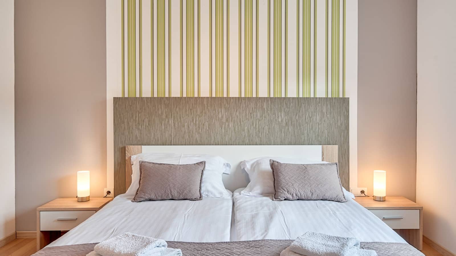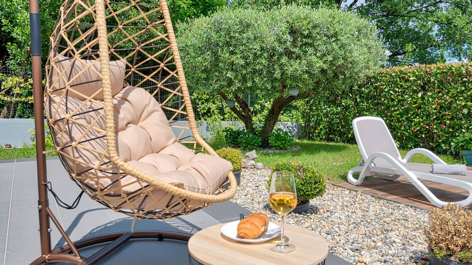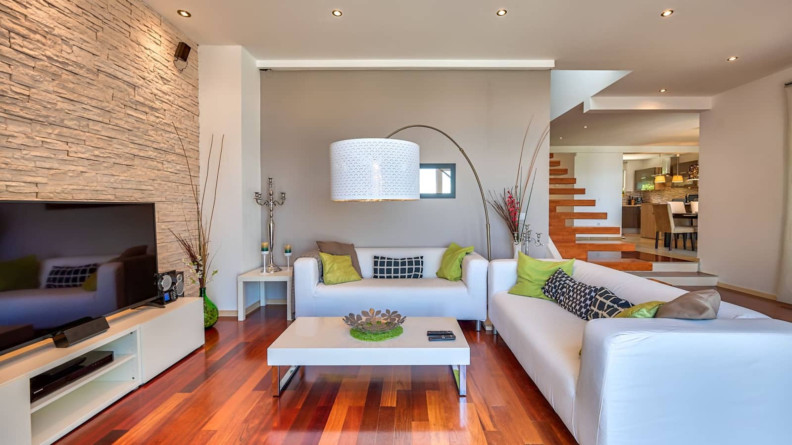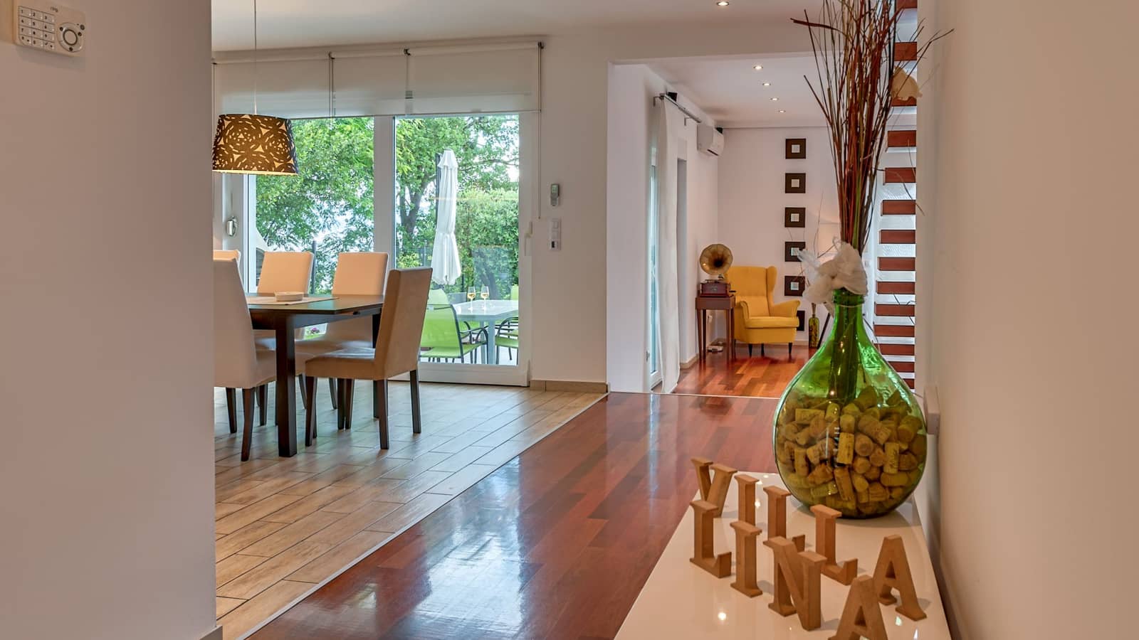 Внутрішній простір продуманий для комфорту: простора вітальня з виходом у сад плавно переходить у зону відпочинку біля басейну. Чотири спальні з двоспальними ліжками мають власні ванні кімнати, кондиціонування та телевізори, забезпечуючи максимальну приватність для кожного гостя. Інтер’єр виконаний у сучасному стилі з акцентом на світлі тони та природні матеріали.