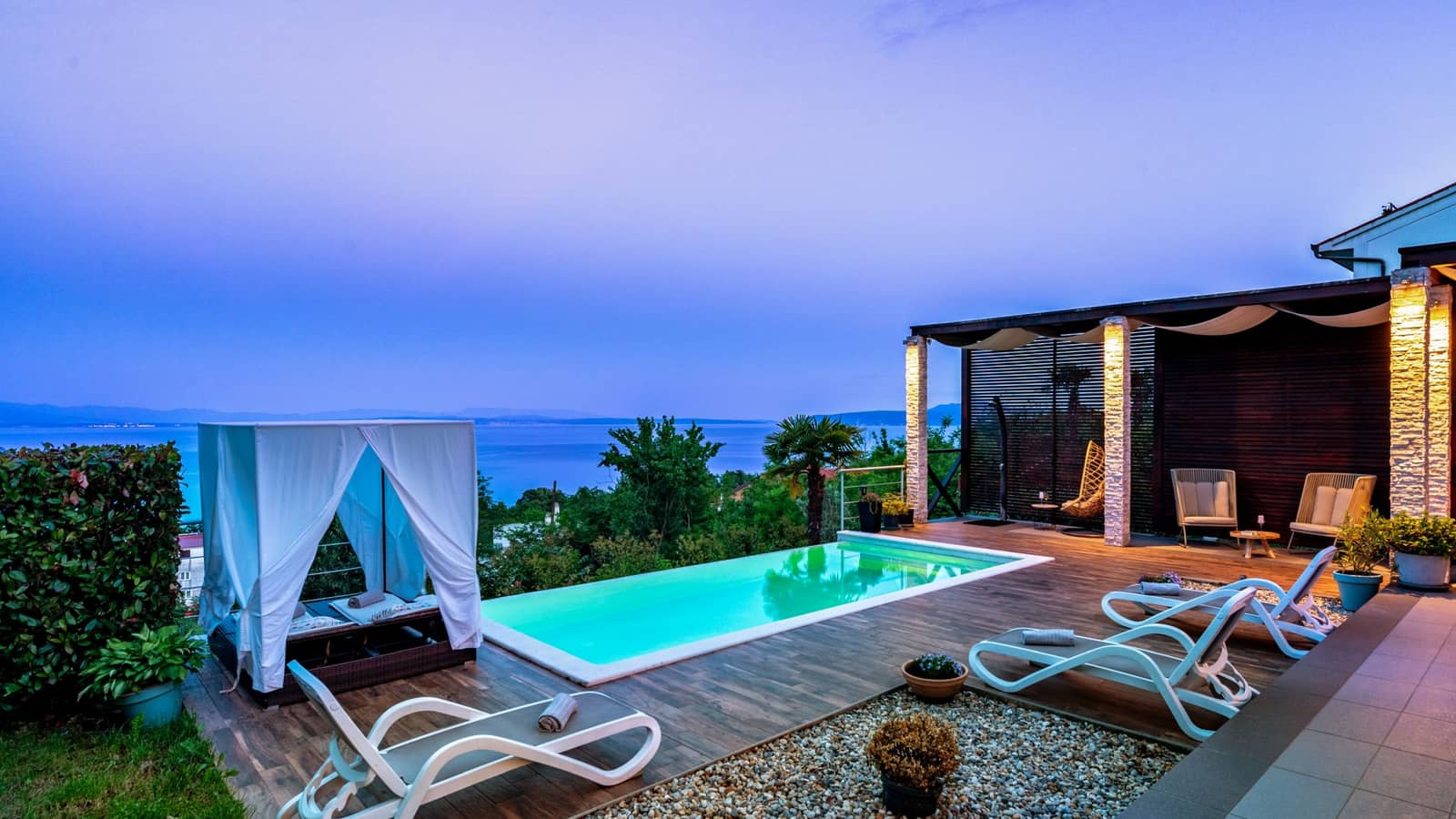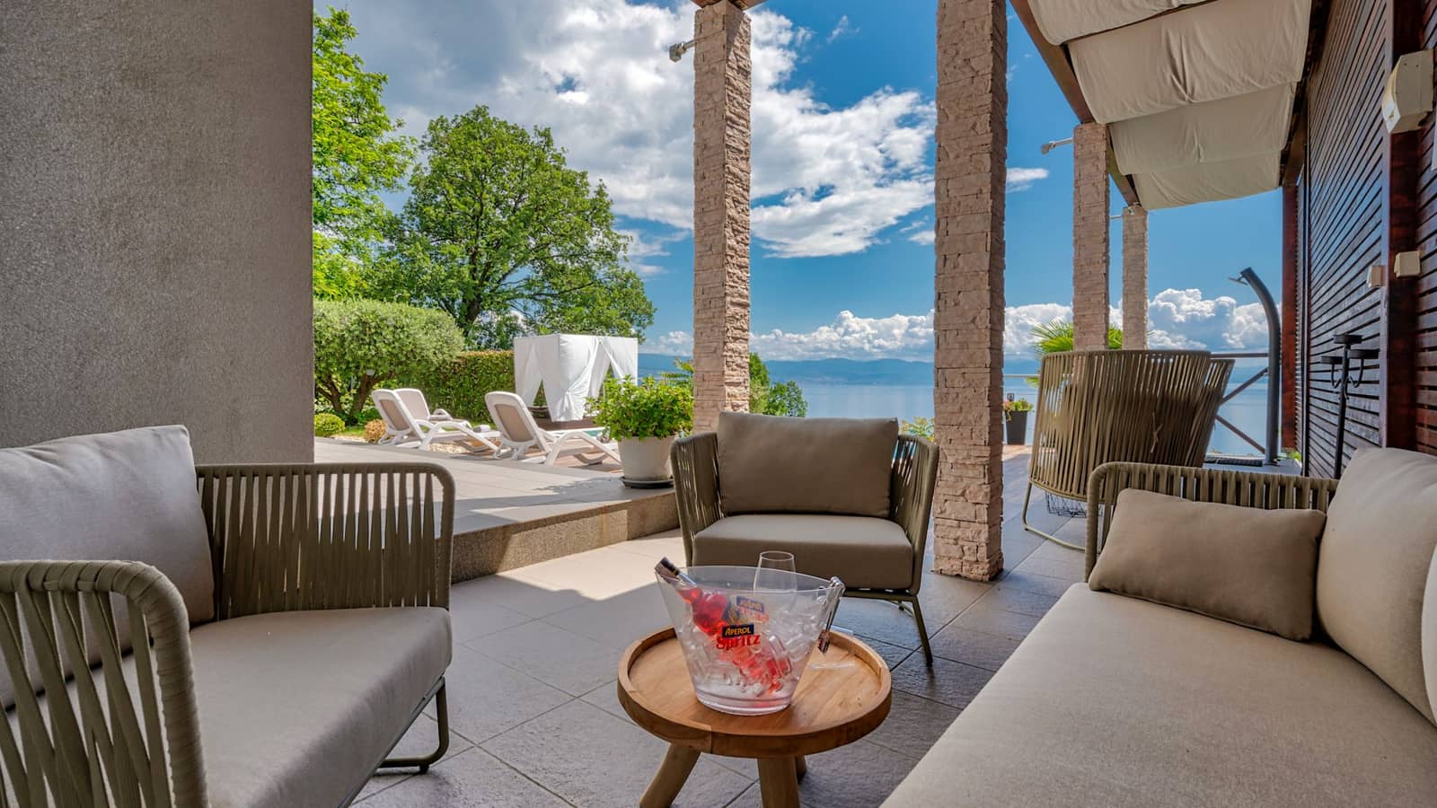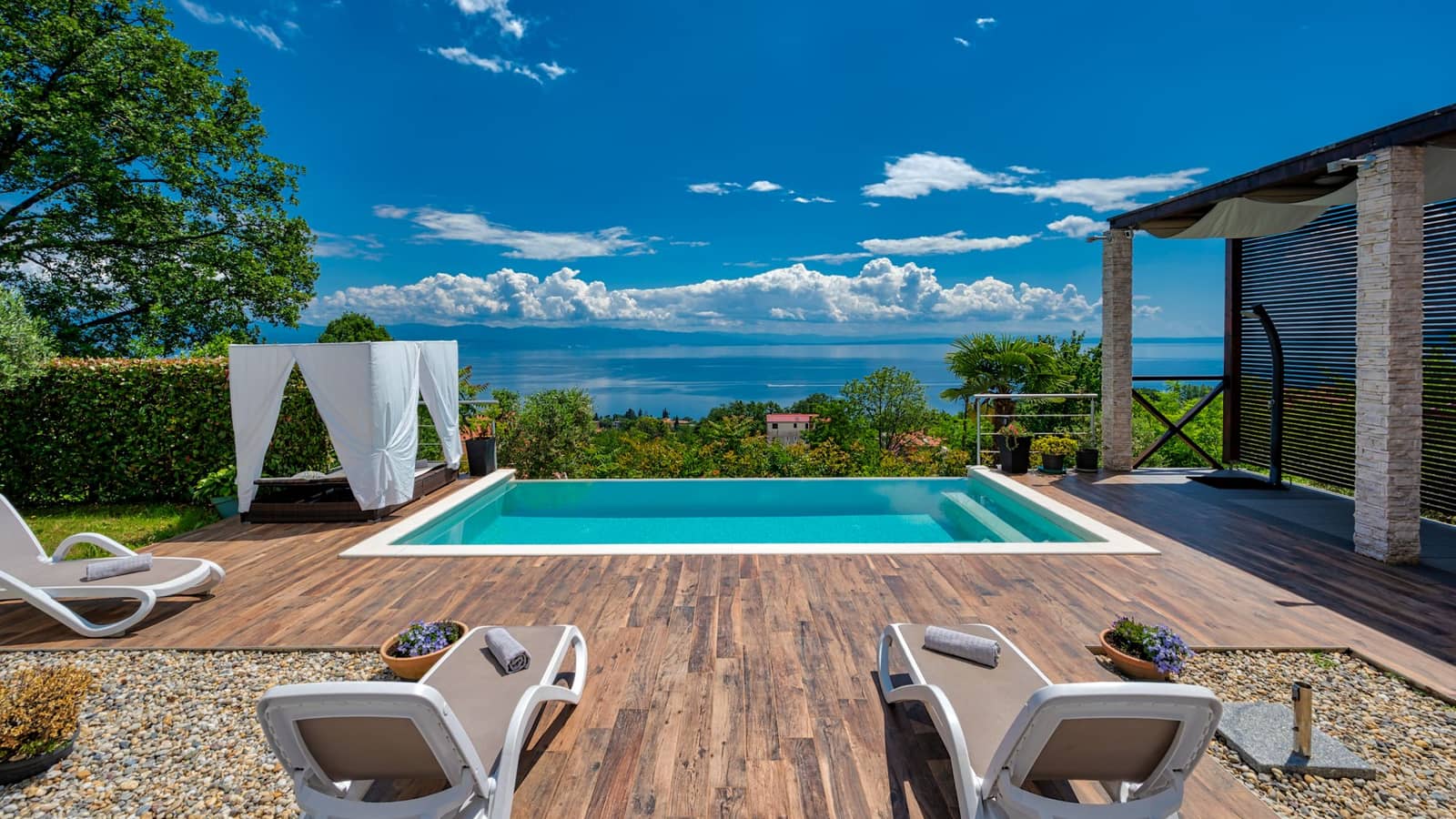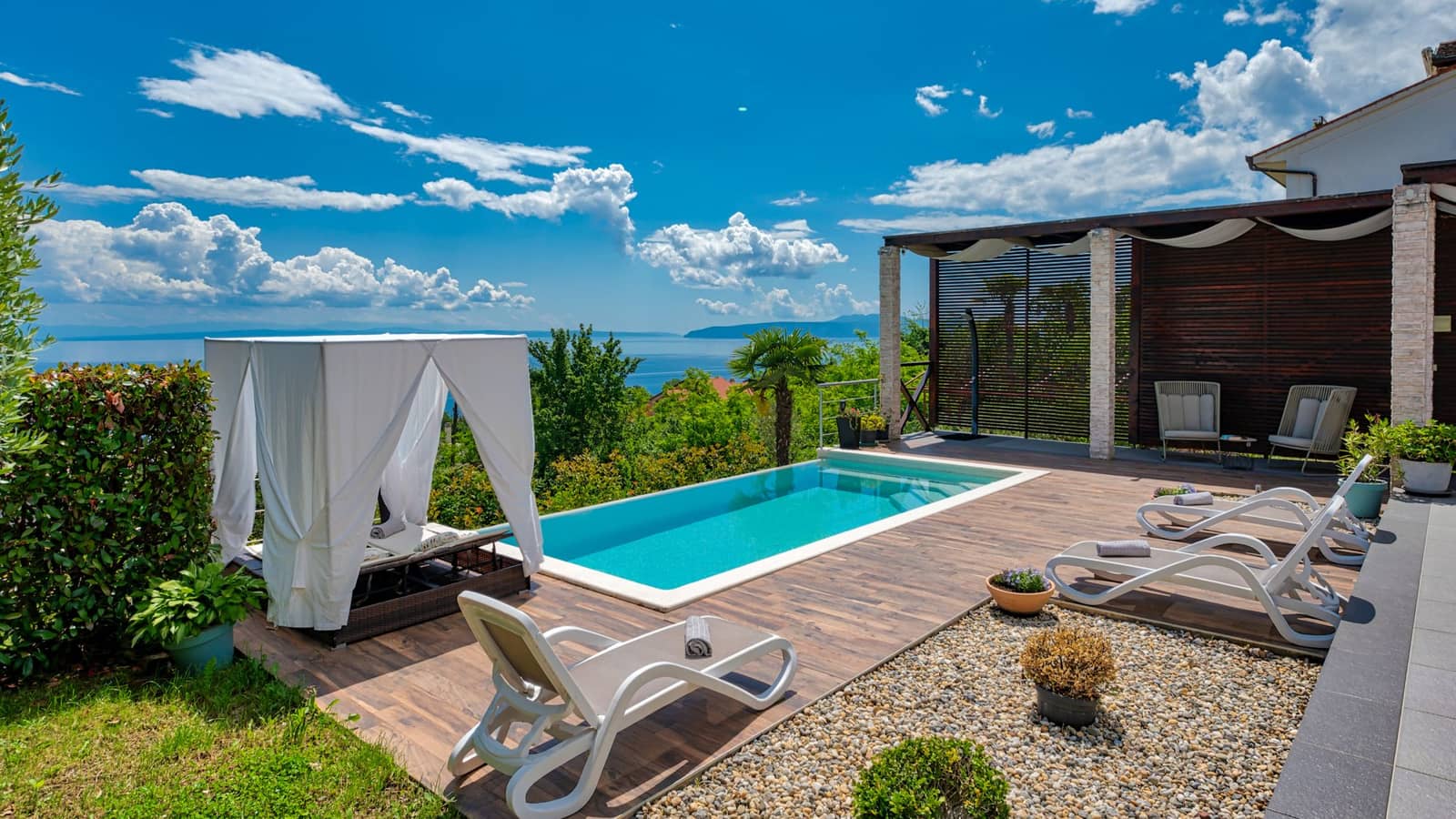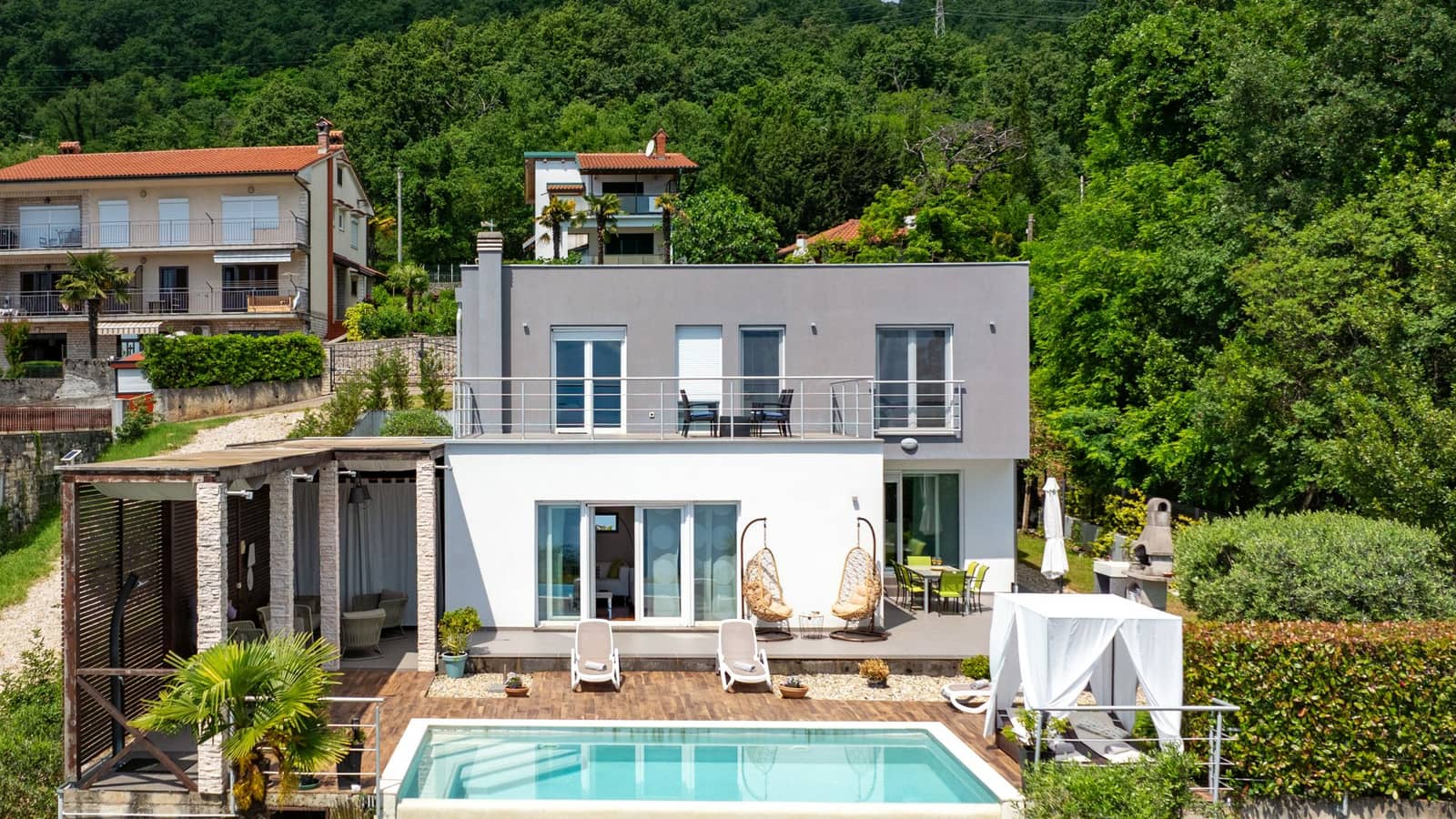 Сучасна вілла на схилі з панорамними видами на Адріатичне море поєднує приватність, стиль і зручне розташування в пішій доступності до пляжу та ресторанів. Простір наповнений світлом завдяки великим вікнам і відкритому плануванню, що створює легку атмосферу для відпочинку з родиною або друзями.