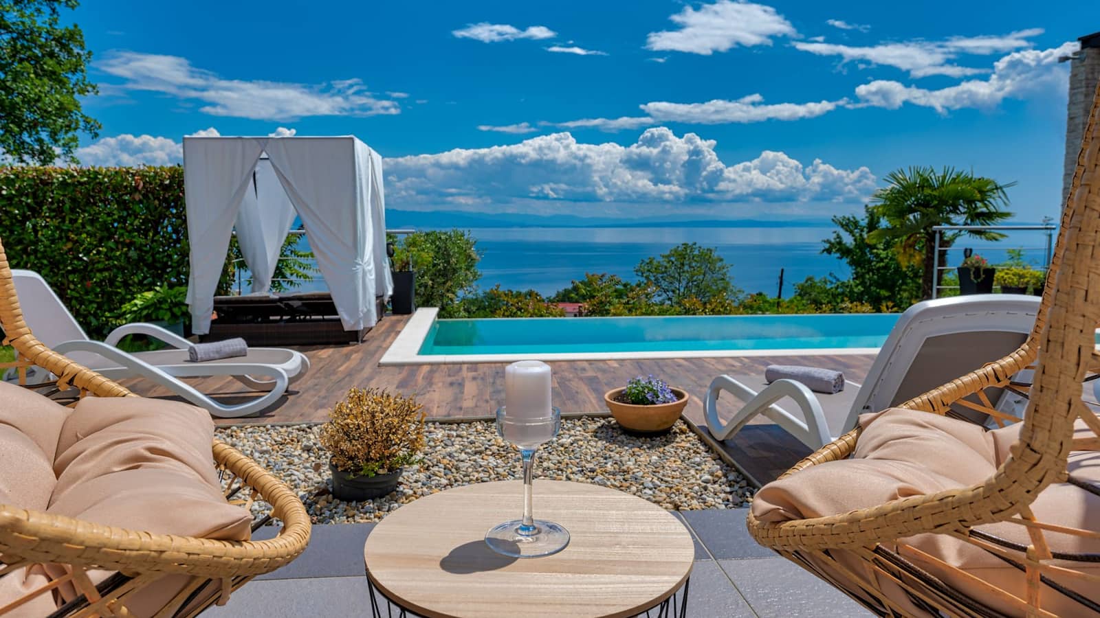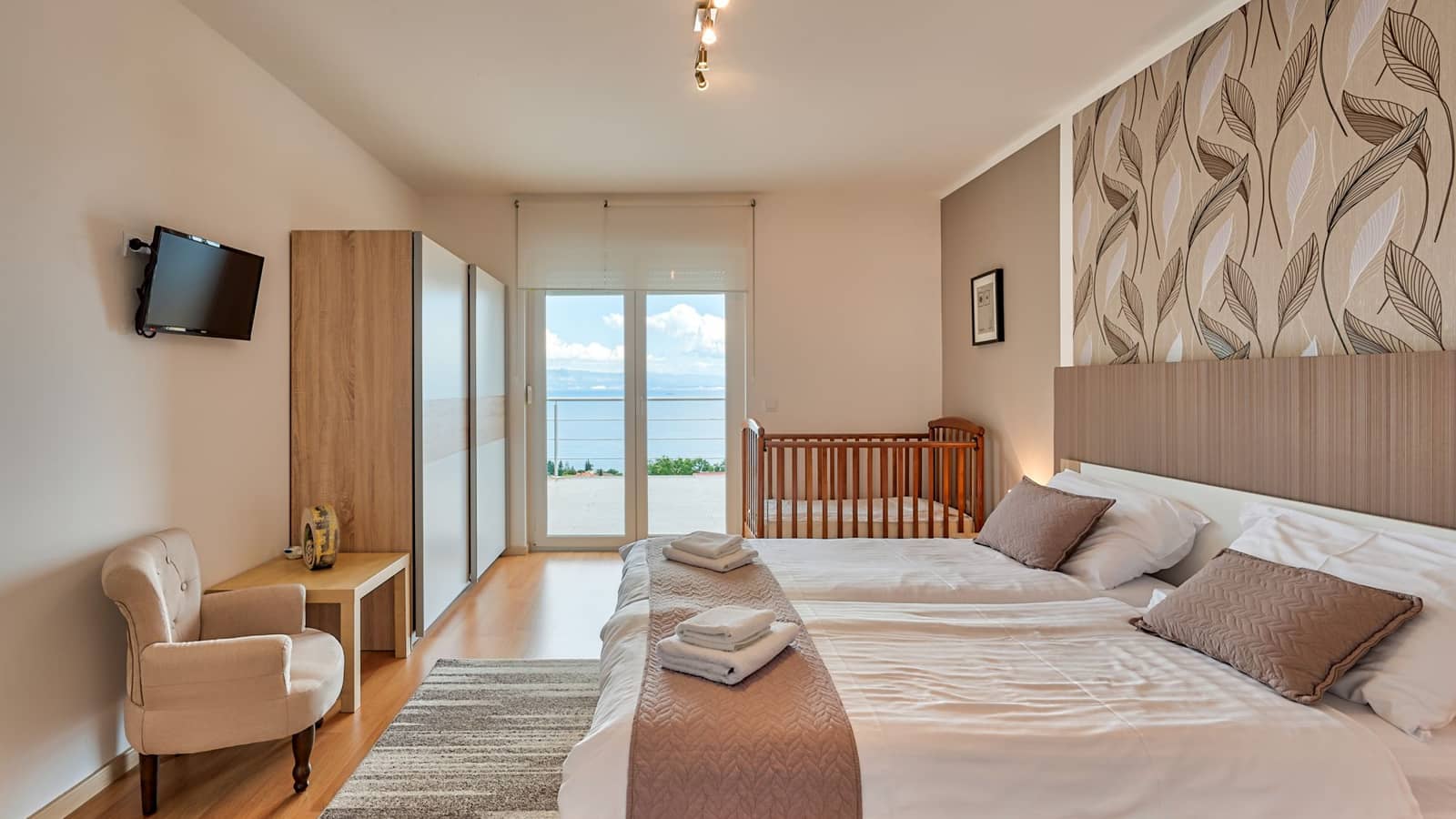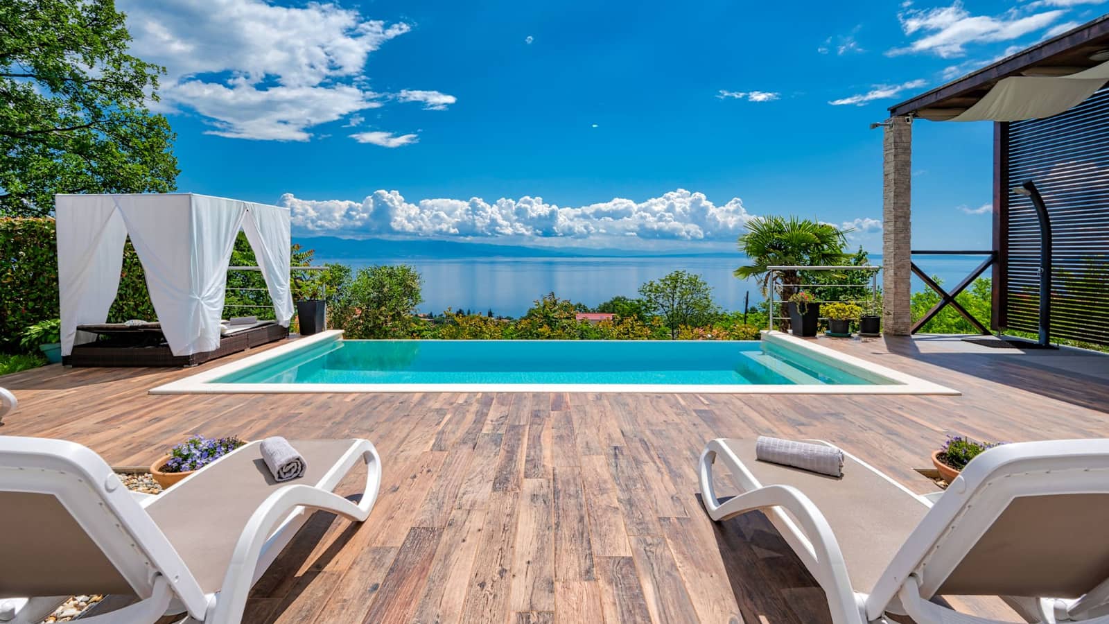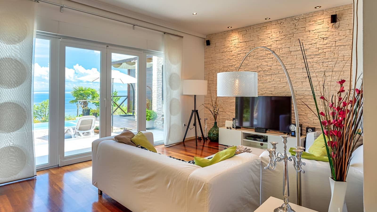 Сучасна вілла на схилі з панорамними видами на Адріатичне море поєднує приватність, стиль і зручне розташування в пішій доступності до пляжу та ресторанів. Простір наповнений світлом завдяки великим вікнам і відкритому плануванню, що створює легку атмосферу для відпочинку з родиною або друзями.