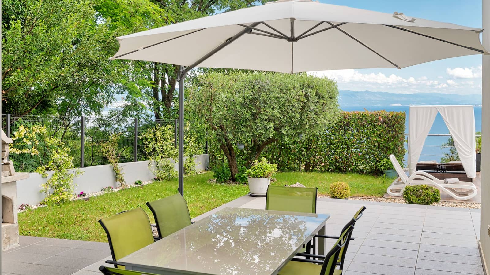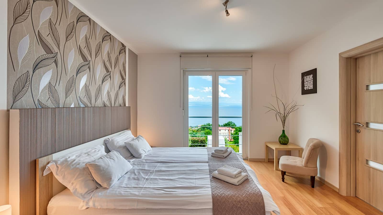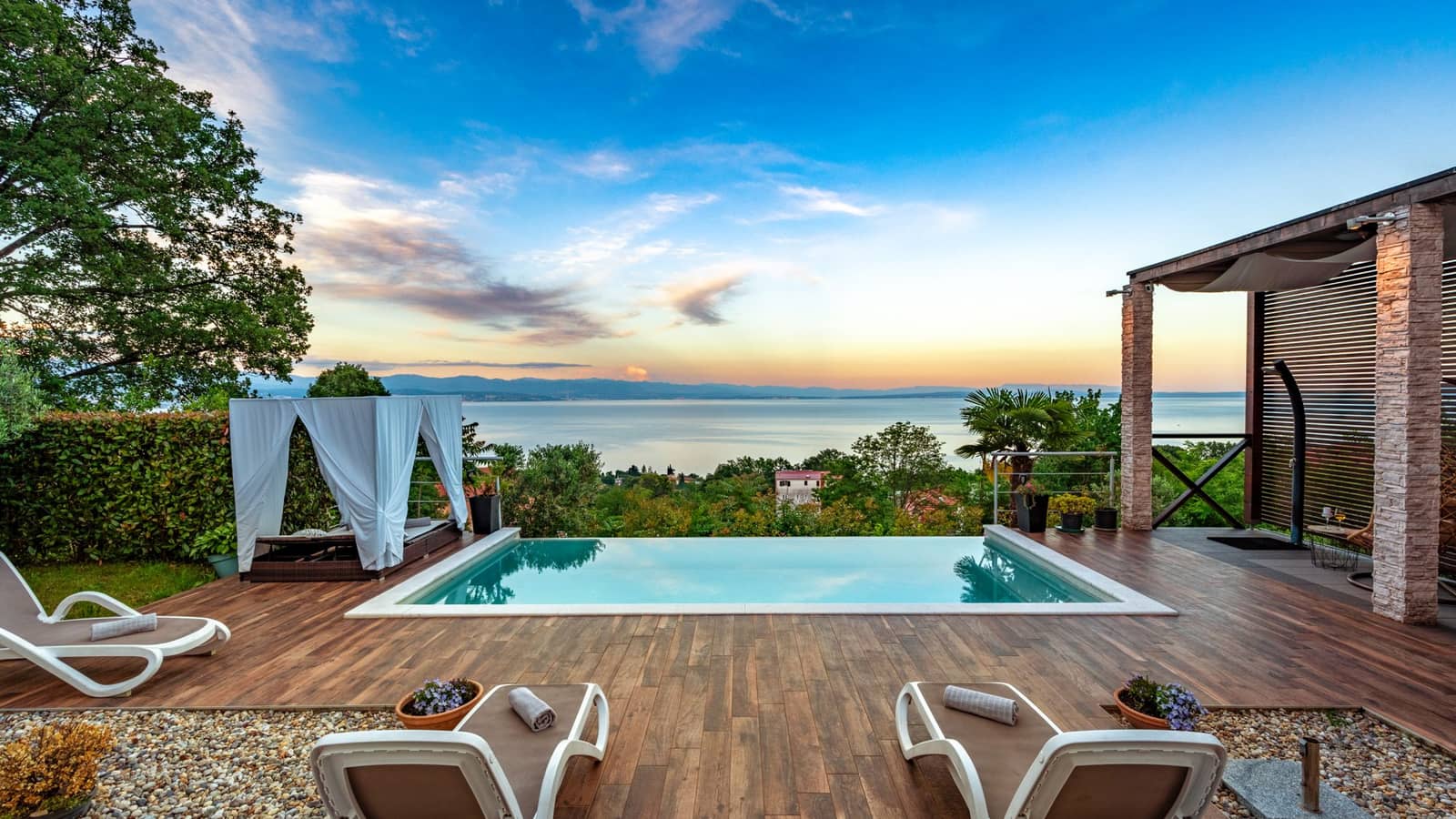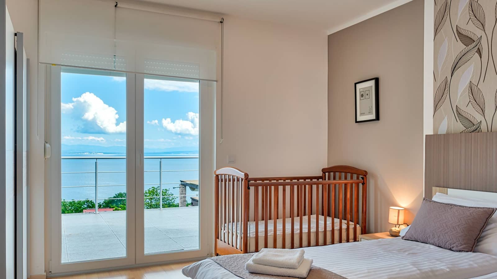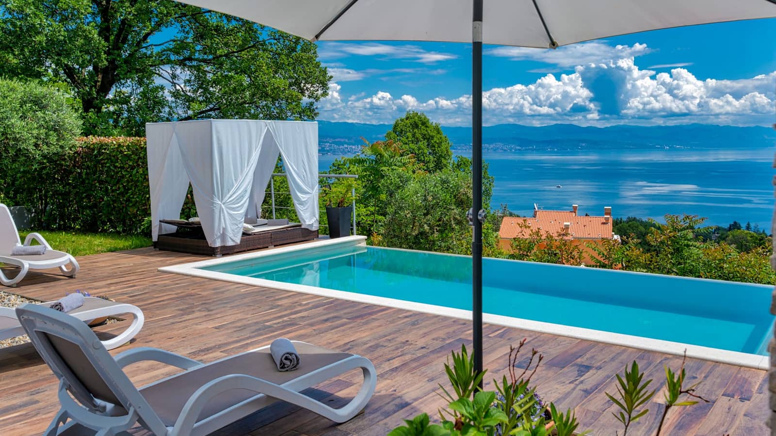 Сучасна вілла на схилі з панорамними видами на Адріатичне море поєднує приватність, стиль і зручне розташування в пішій доступності до пляжу та ресторанів. Простір наповнений світлом завдяки великим вікнам і відкритому плануванню, що створює легку атмосферу для відпочинку з родиною або друзями.