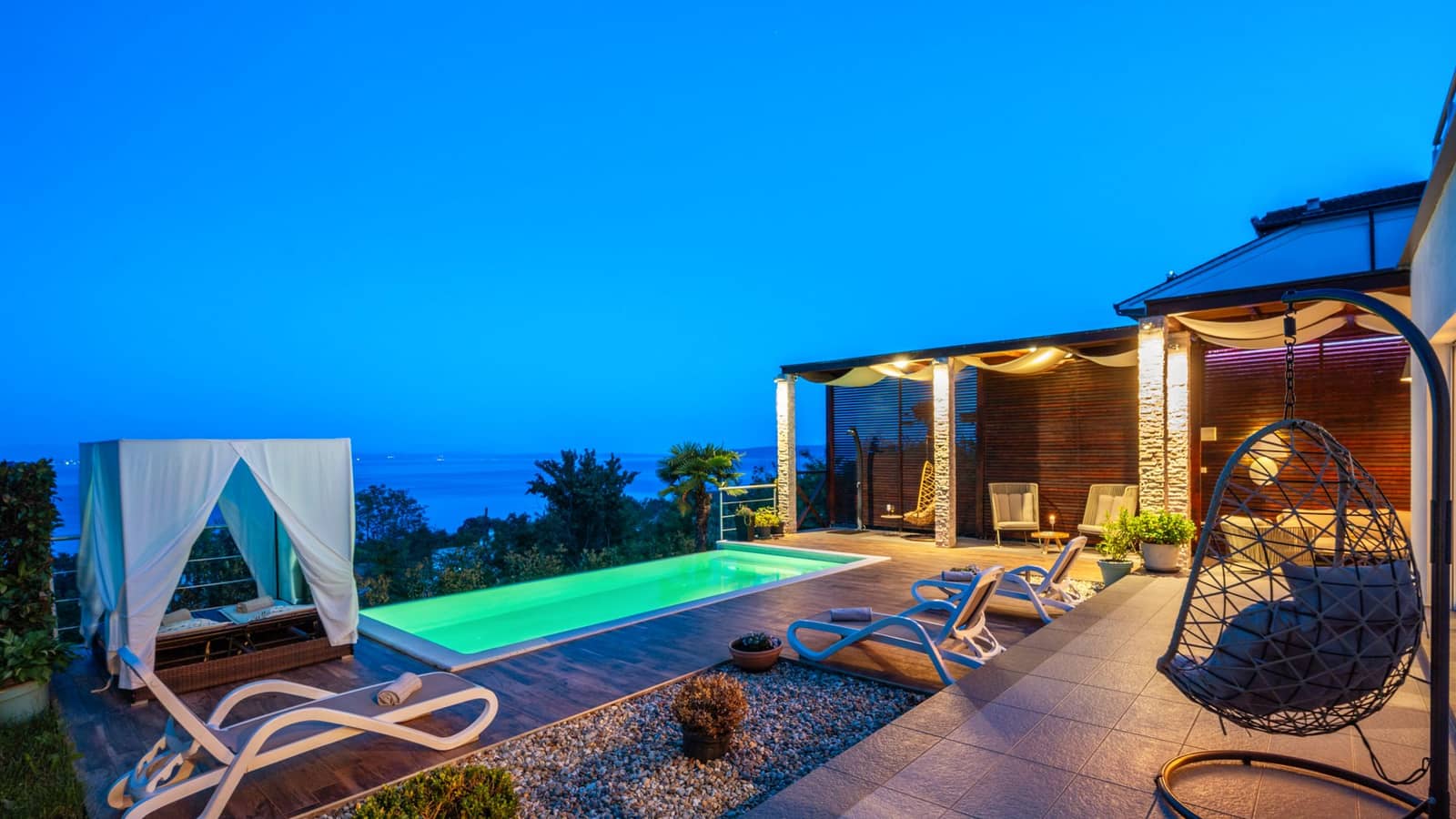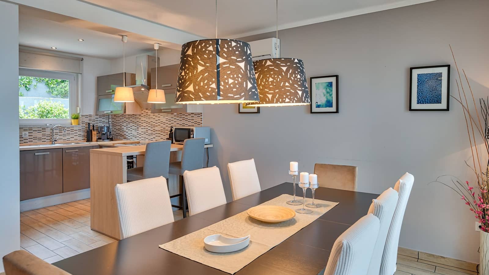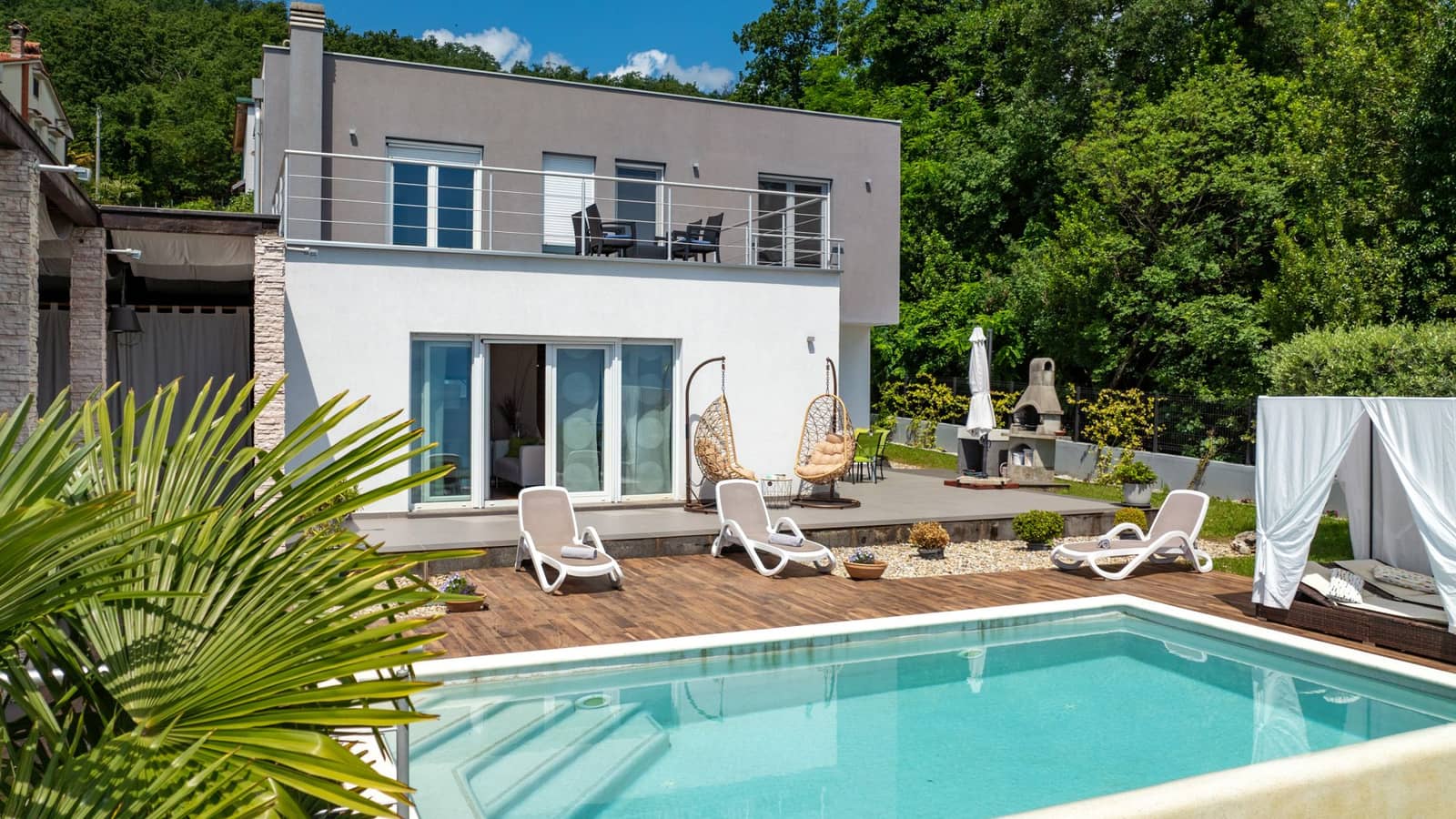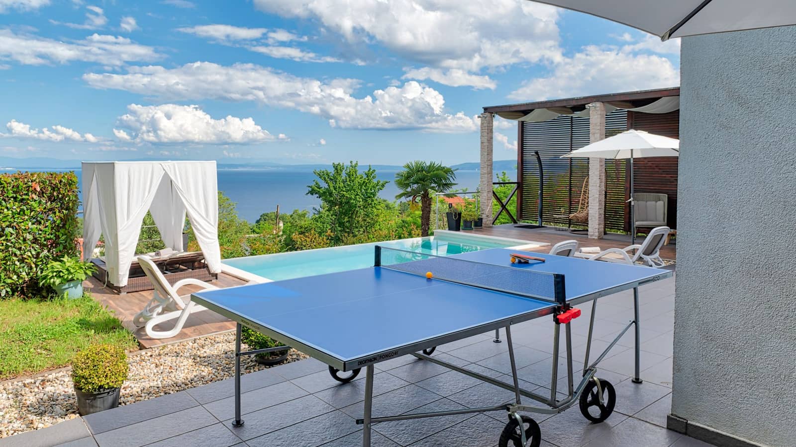 Сучасна вілла на схилі з панорамними видами на Адріатичне море поєднує приватність, стиль і зручне розташування в пішій доступності до пляжу та ресторанів. Простір наповнений світлом завдяки великим вікнам і відкритому плануванню, що створює легку атмосферу для відпочинку з родиною або друзями.