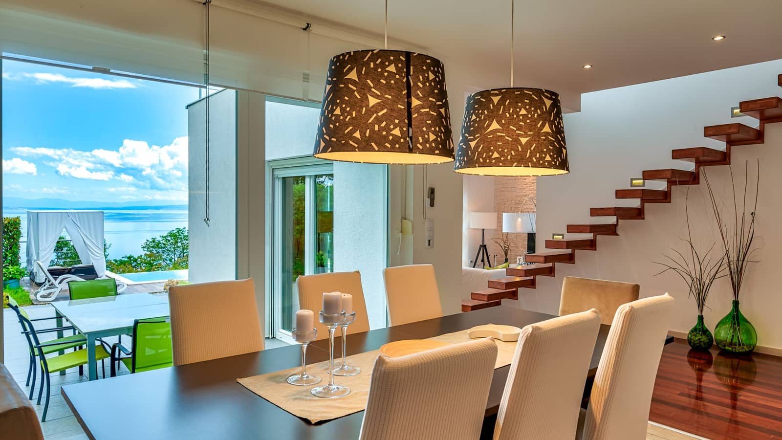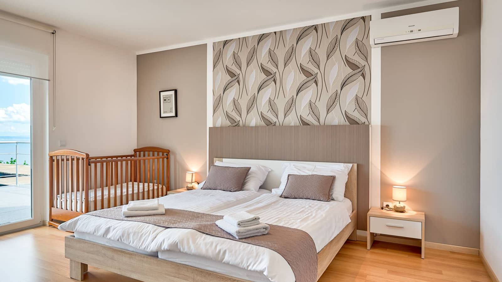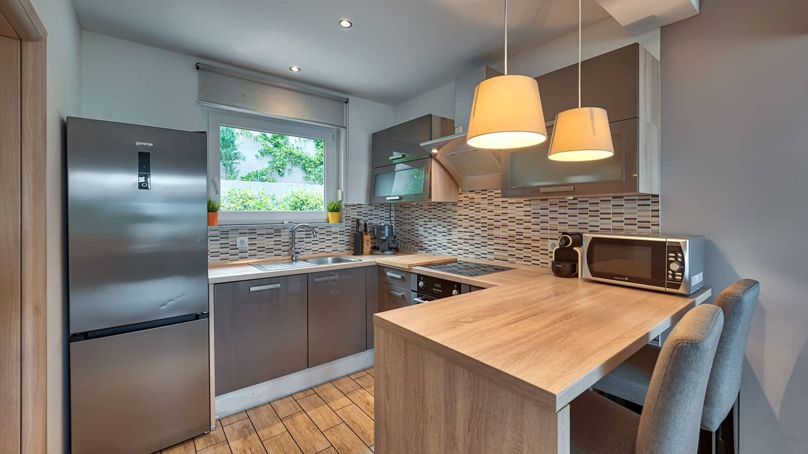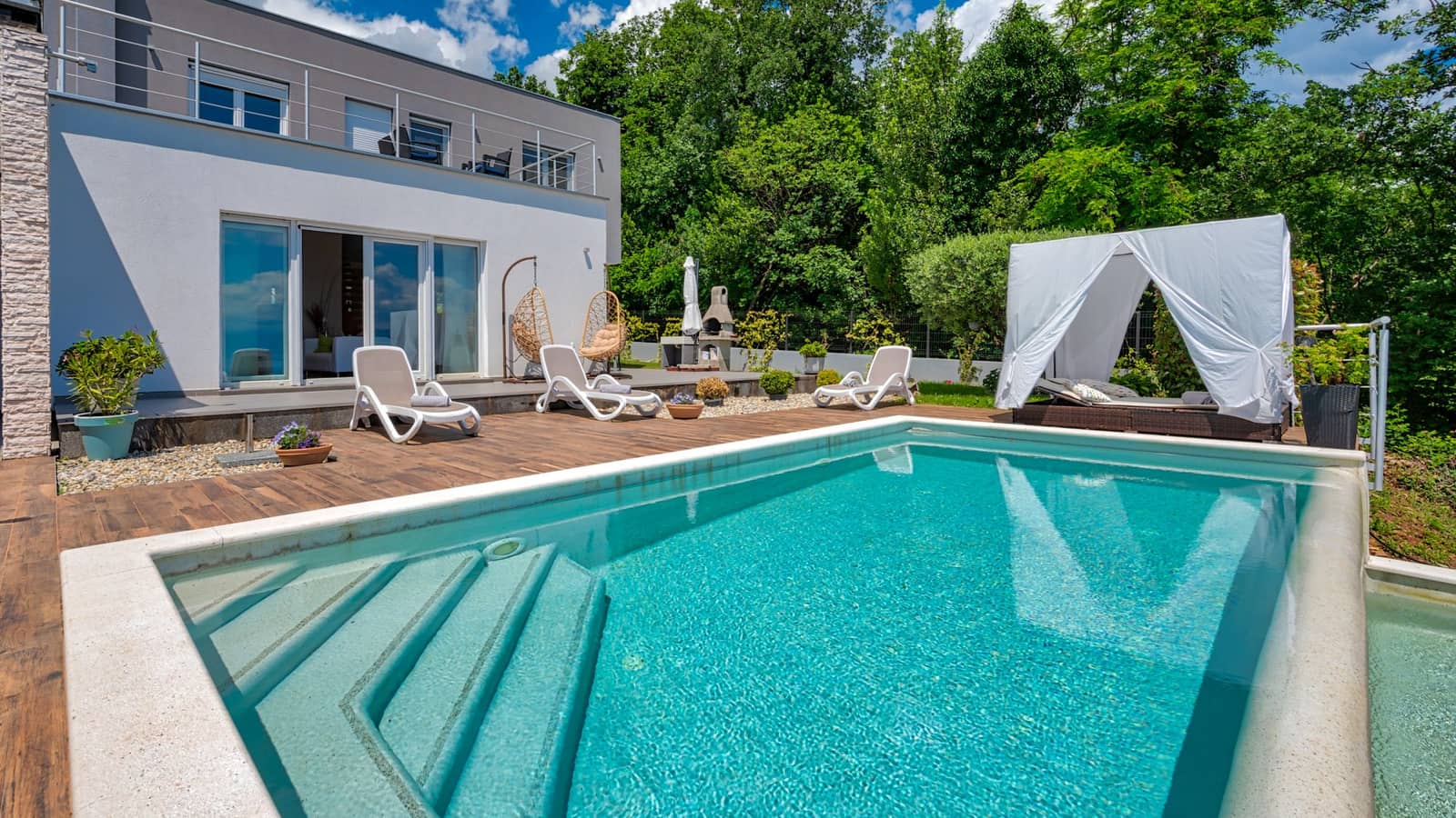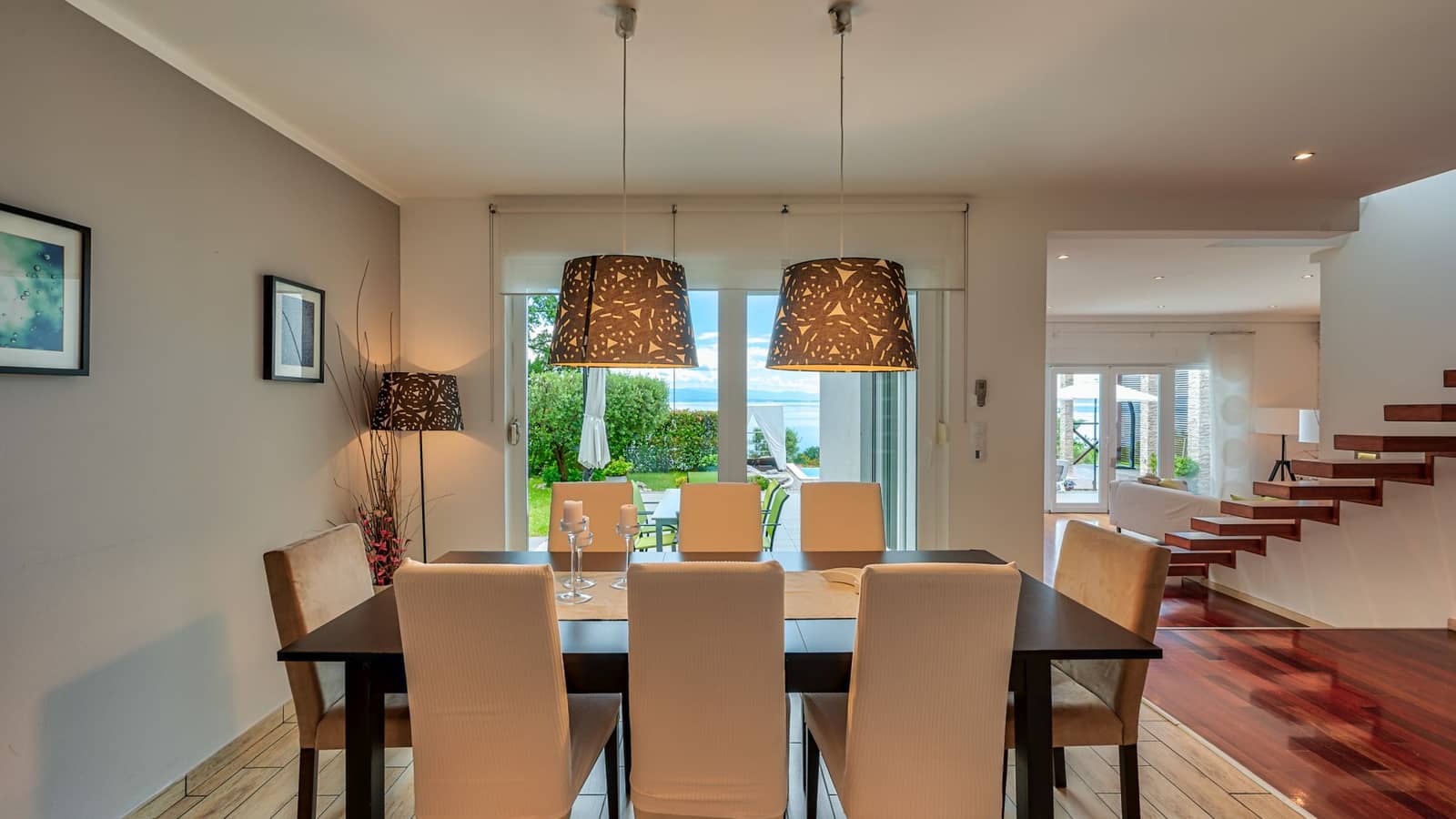 Сучасна вілла на схилі з панорамними видами на Адріатичне море поєднує приватність, стиль і зручне розташування в пішій доступності до пляжу та ресторанів. Простір наповнений світлом завдяки великим вікнам і відкритому плануванню, що створює легку атмосферу для відпочинку з родиною або друзями.